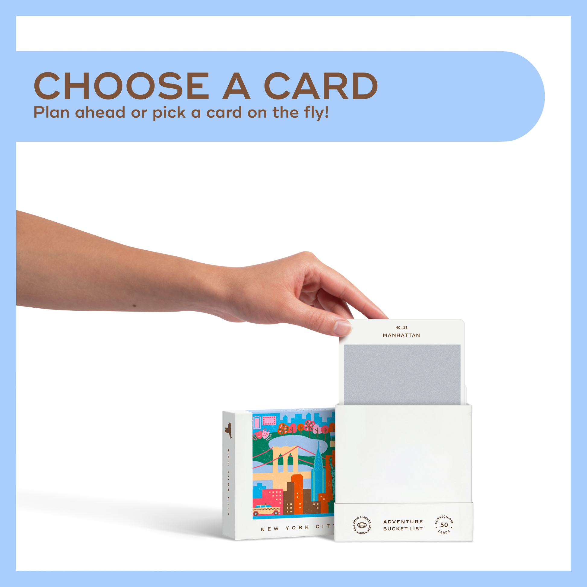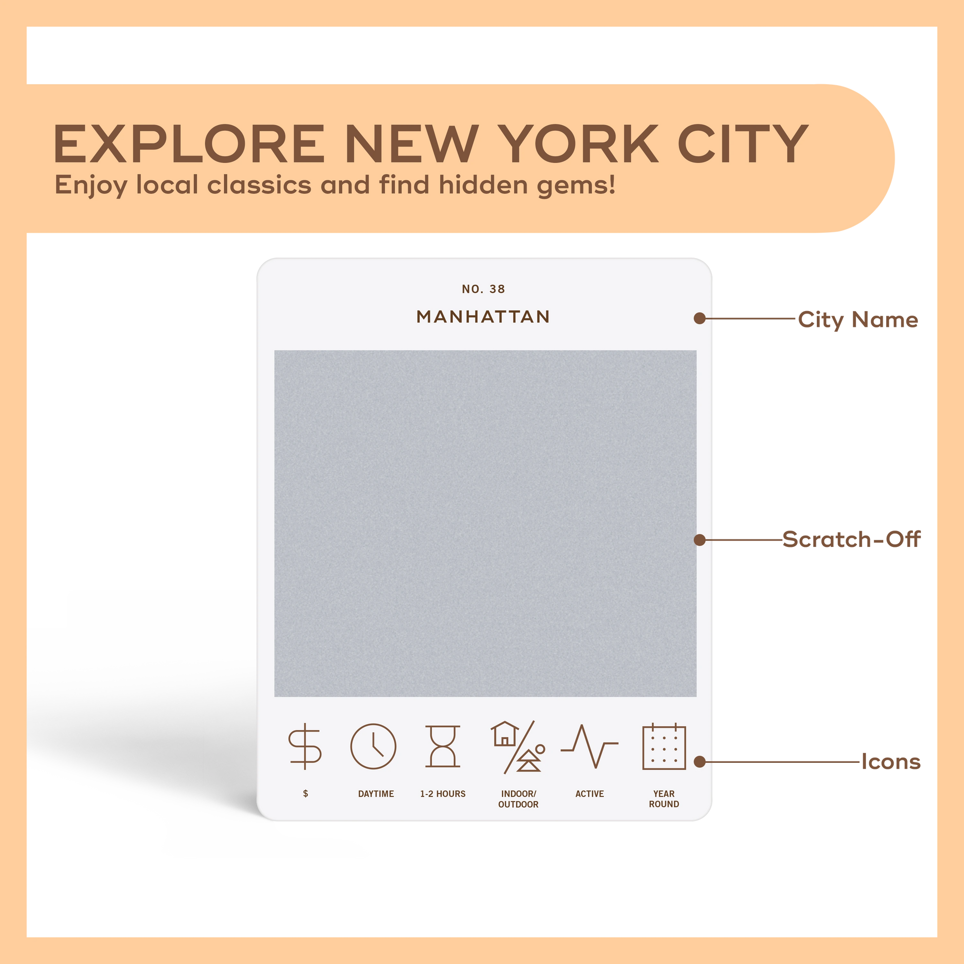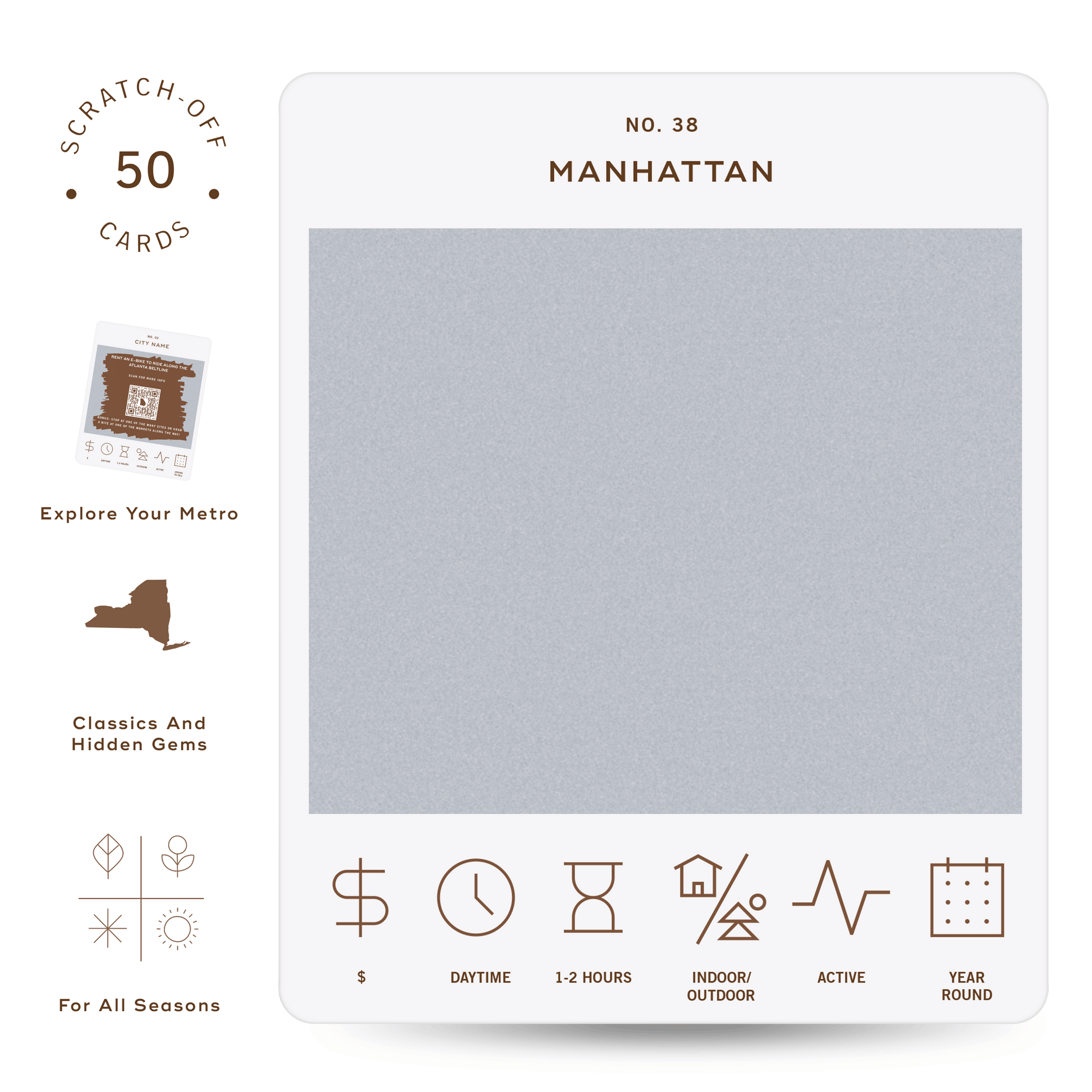 50 scratch off bucket list adventures all within one hour of the city of New York City. Pick an area of the city that you want to explore, check out the icons at the bottom of the card to determine the season, cost, and time of day, and then scratch off the card to reveal your adventure!