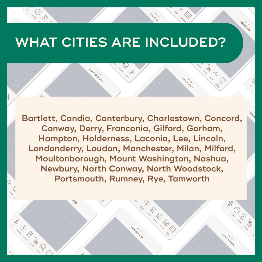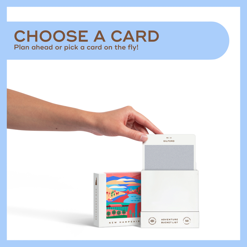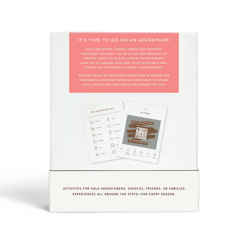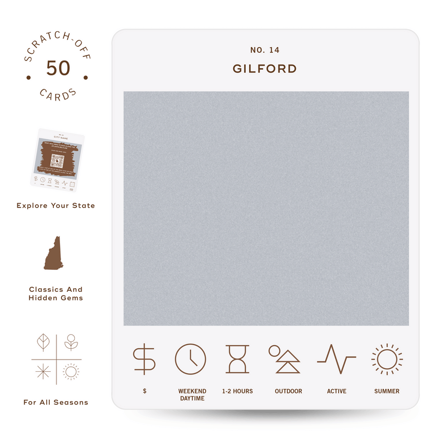 50 scratch off bucket list adventures around the state of New Hampshire. Pick a city that you want to explore, check out the icons at the bottom of the card to determine the season, cost, and time of day, and then scratch off the card to reveal your adventure!