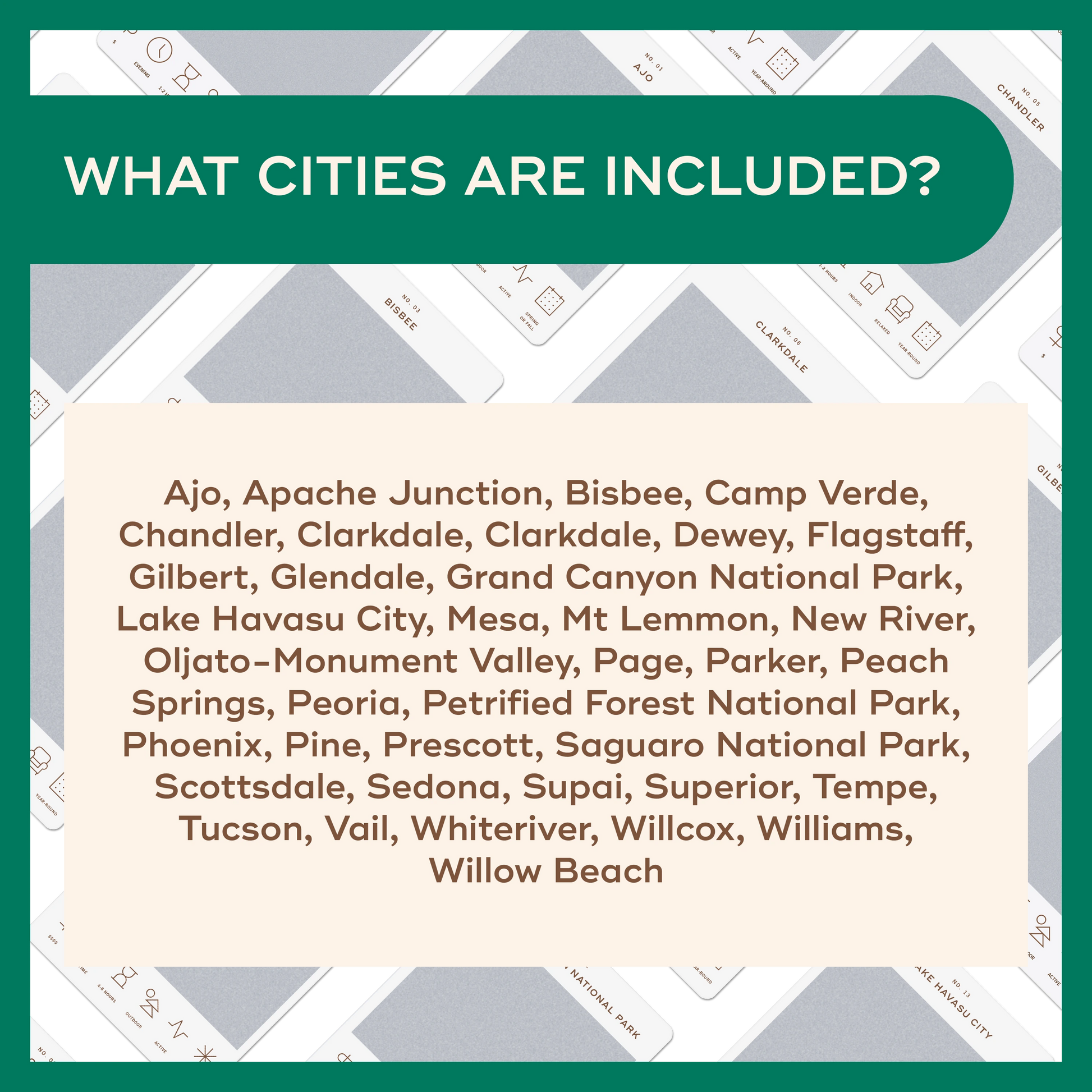 50 scratch off bucket list adventures around the state of Arizona. Pick a city that you want to explore, check out the icons at the bottom of the card to determine the season, cost, and time of day, and then scratch off the card to reveal your adventure!