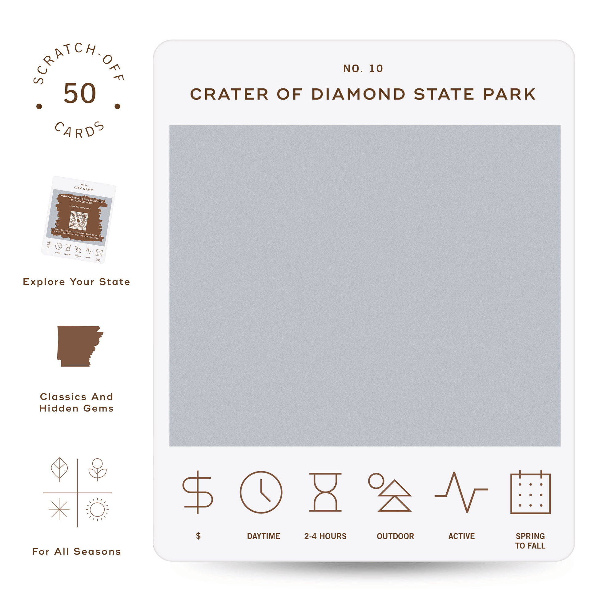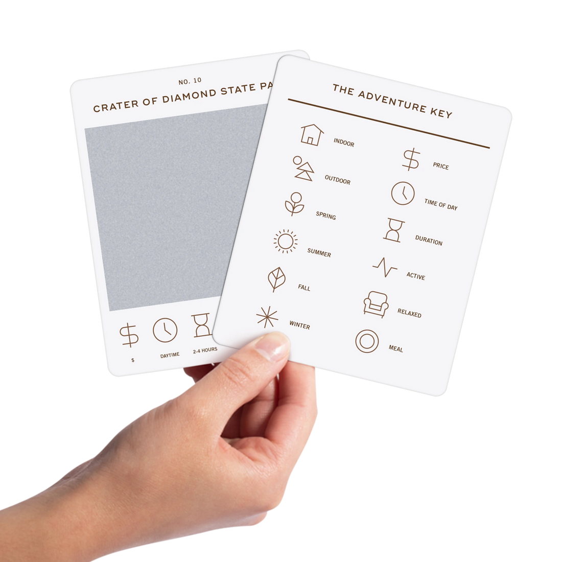 50 scratch off bucket list adventures around the state of Arkansas. Pick a city that you want to explore, check out the icons at the bottom of the card to determine the season, cost, and time of day, and then scratch off the card to reveal your adventure!