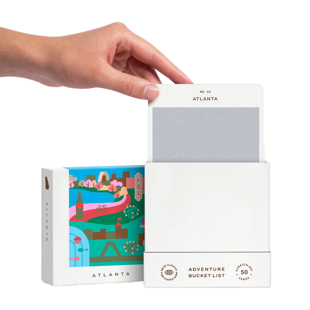 50 scratch-off bucket list adventures in & around Atlanta, GA. Pick an area that you want to explore, check out the icons at the bottom of the card to determine the season, cost, and time of day, and then scratch off the card to reveal your adventure!