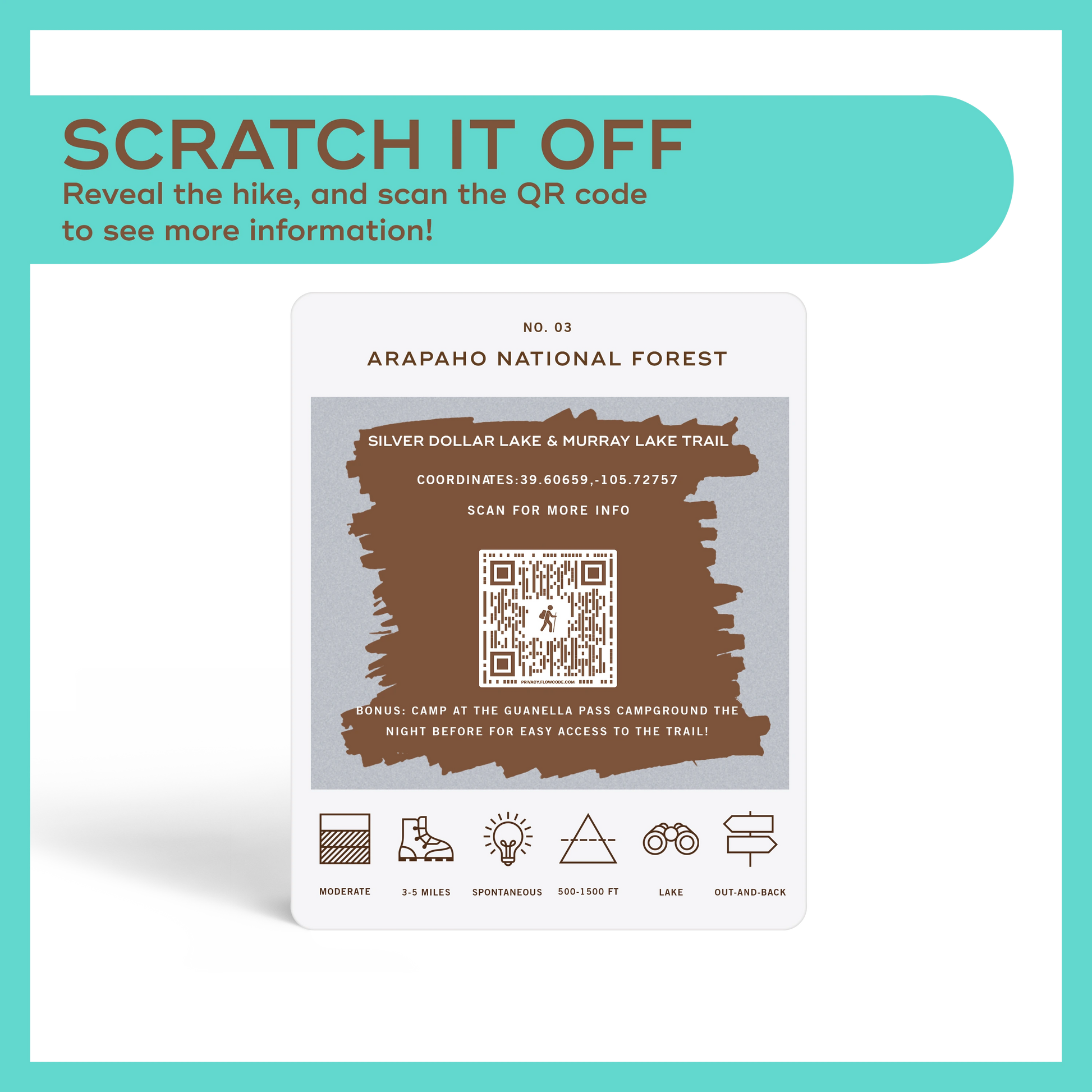 To reveal the hike, just scratch off the foil. Want more info before you go? Scan the QR code on the card with your phone to unlock trail details, directions, tips, and nearby bonus stops on our website. It’s the perfect blend of mystery, planning, and adventure.