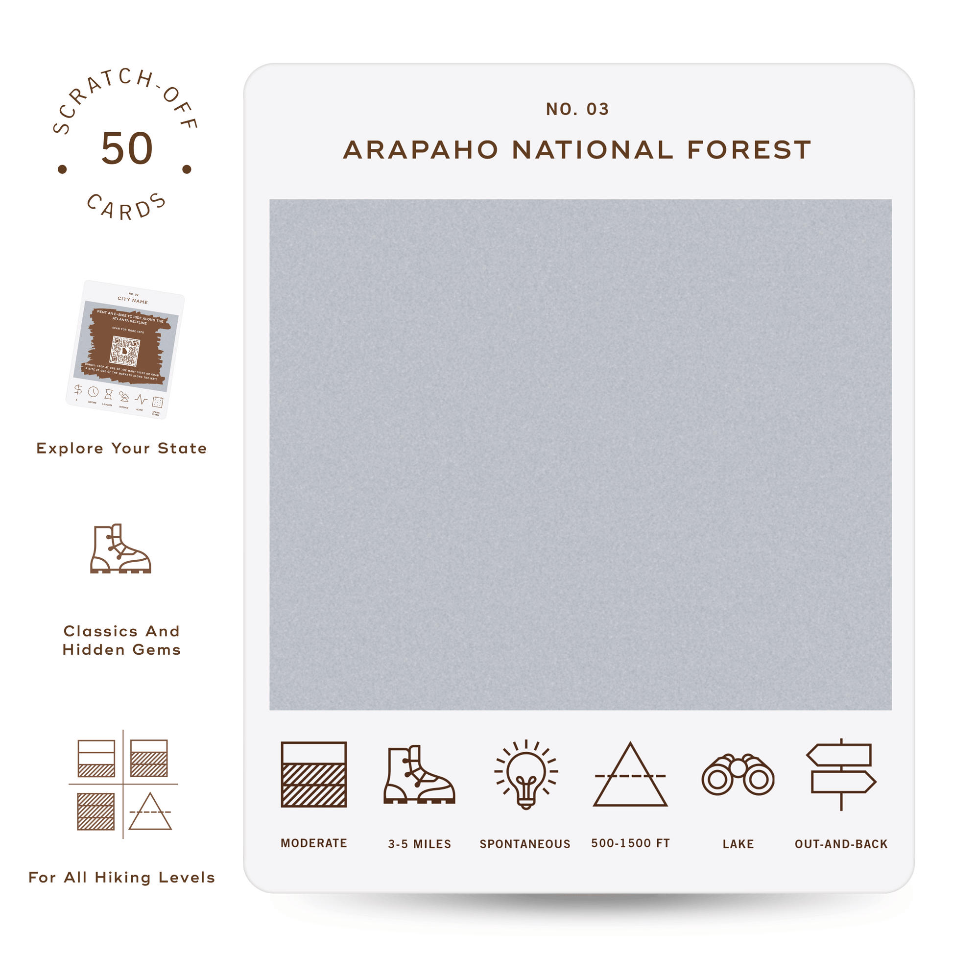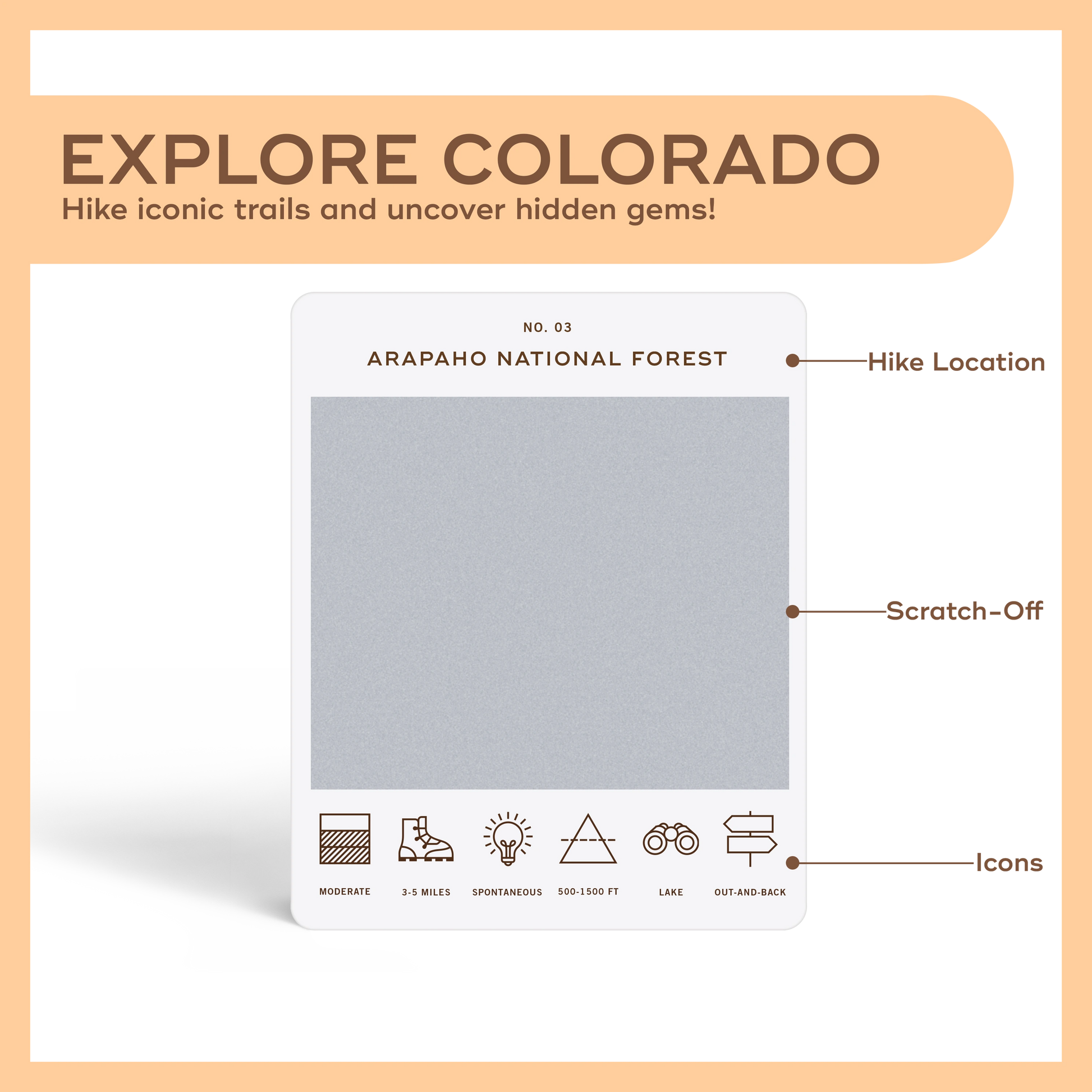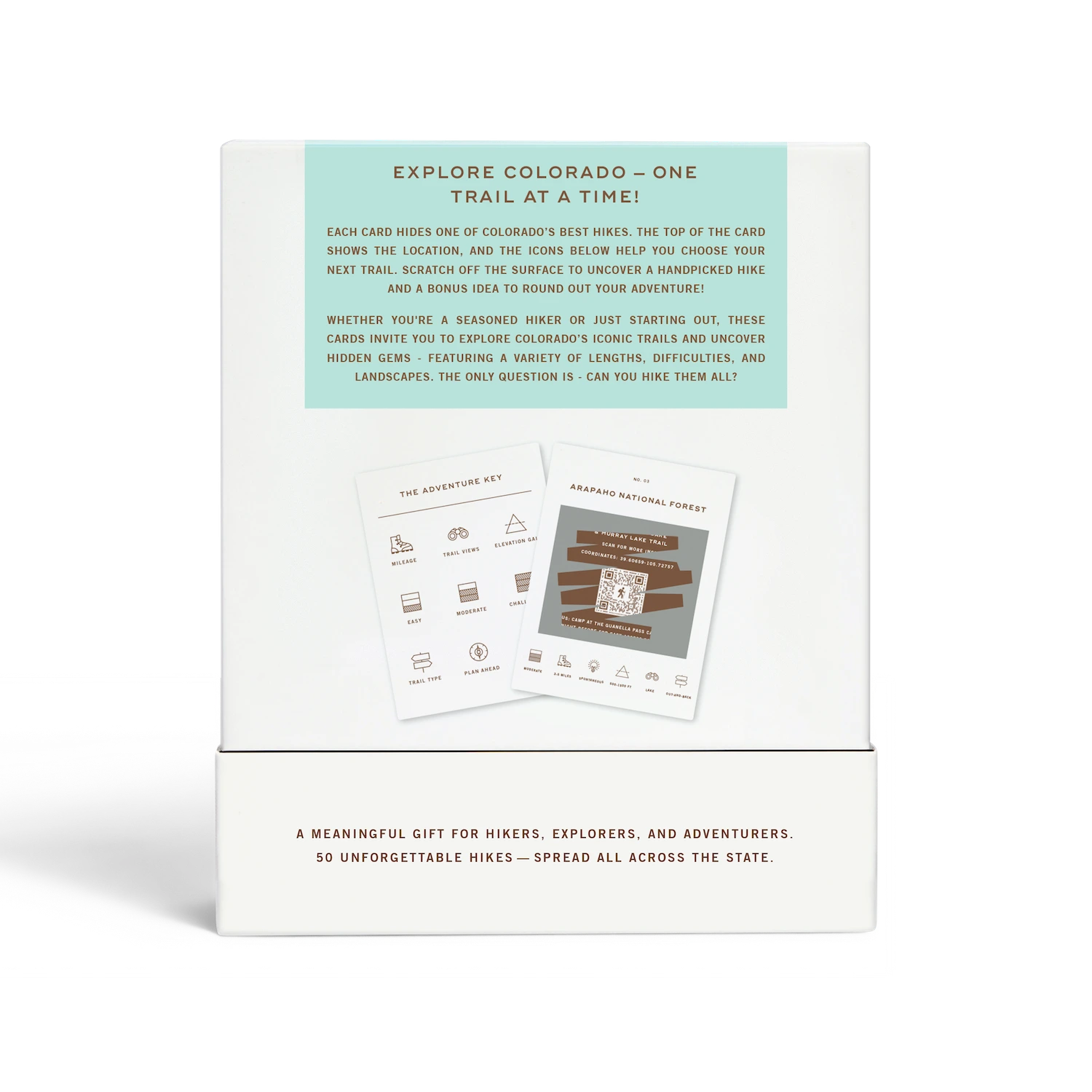Discover 50 unforgettable hikes across the mountains, valleys, forests, and canyons of Colorado. Whether you’re chasing panoramic views, alpine lakes, or rugged switchbacks, this scratch-off hiking challenge helps you explore the most scenic trails the state has to offer. Each card gives you just enough info to plan ahead—or embrace the unknown. Scratch to reveal your hike, lace up your boots, and hit the trail! Use the icons at the bottom of each card to quickly gauge difficulty, distance, elevation gain, trail type, and how much planning you'll need. Each hike also includes a QR code that links to full trail details, maps, and any real-time updates.