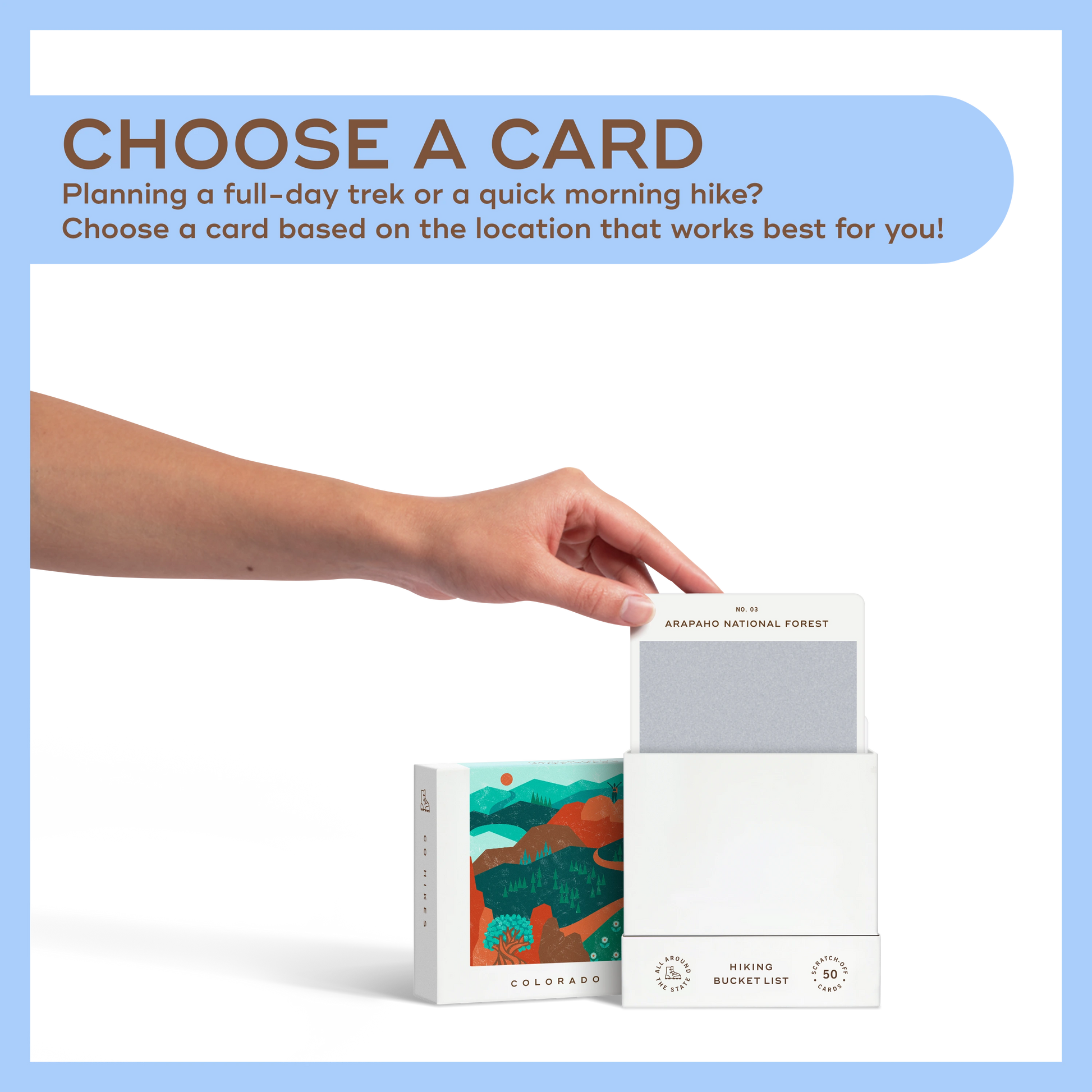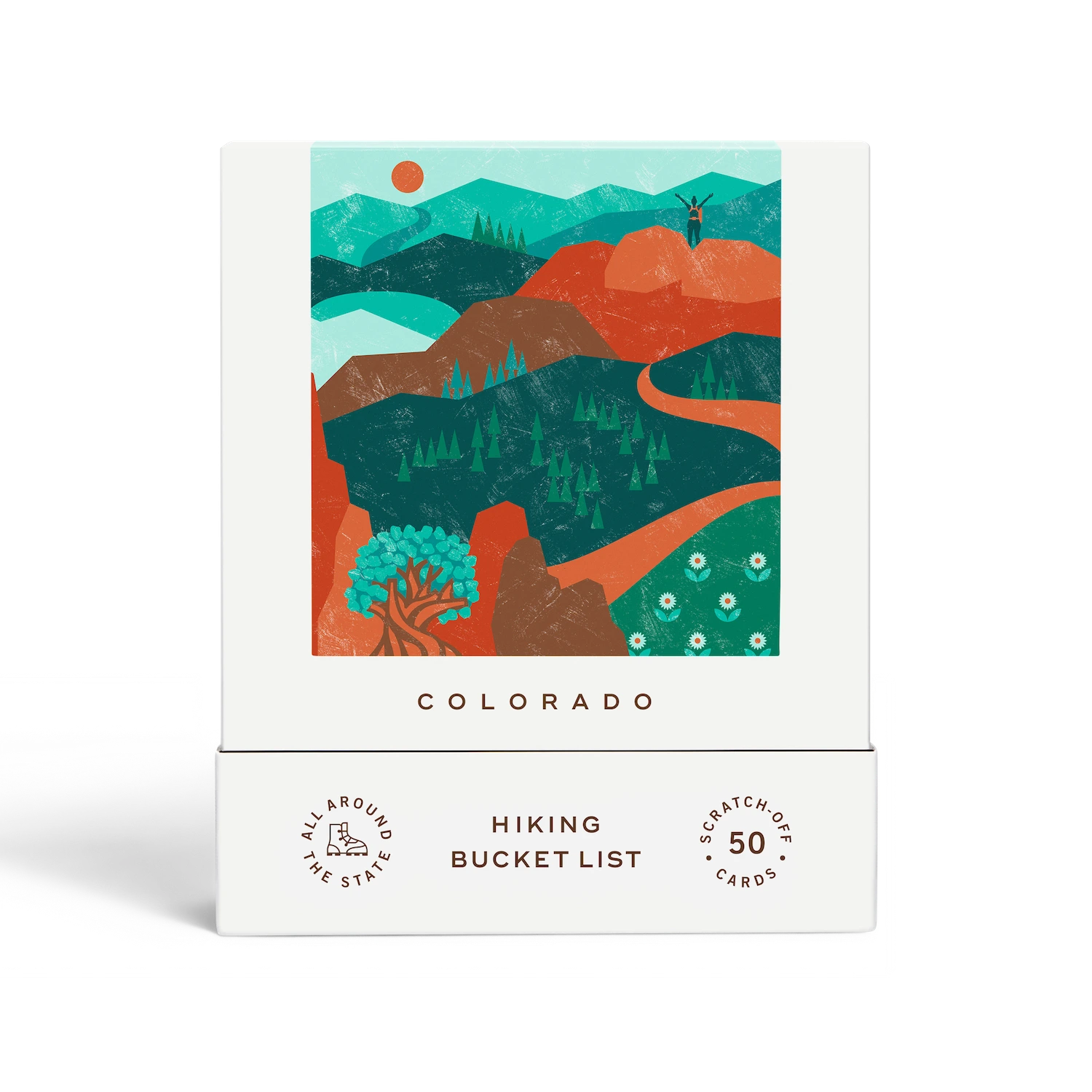 The Colorado Hiking Bucket List is a deck of 50 scratch-off cards, each featuring a unique hike somewhere in the state. Every card includes the name of the hike, the nearest town or region, and helpful icons that highlight key details like distance, elevation gain, difficulty, views, and more.