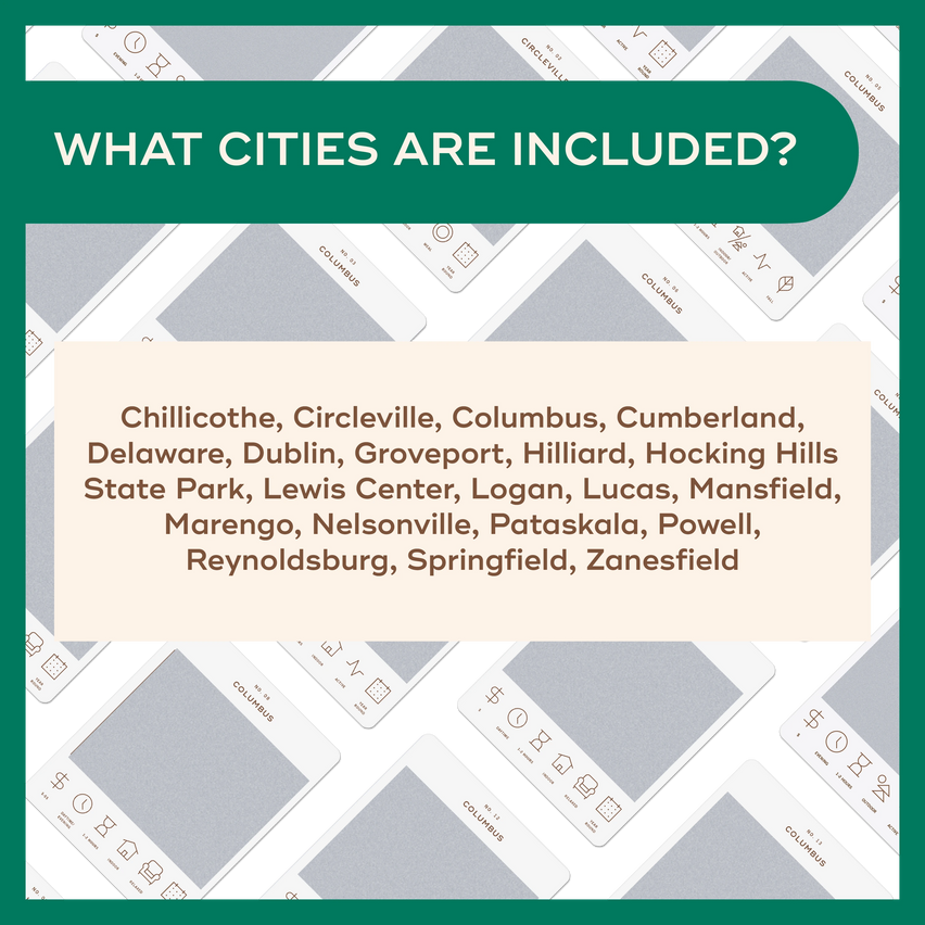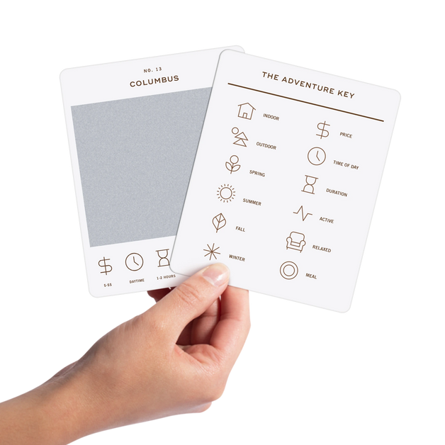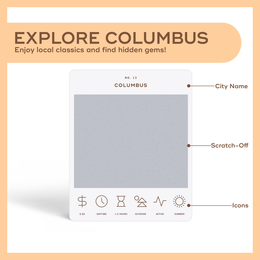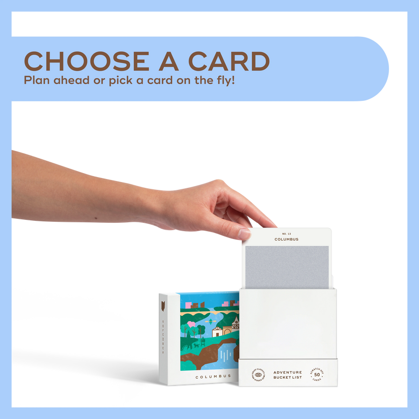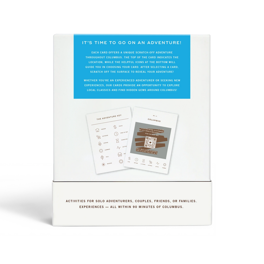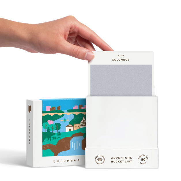 50 scratch off bucket list adventures all within one hour of the city of Columbus. Pick an area of the city that you want to explore, check out the icons at the bottom of the card to determine the season, cost, and time of day, and then scratch off the card to reveal your adventure!
