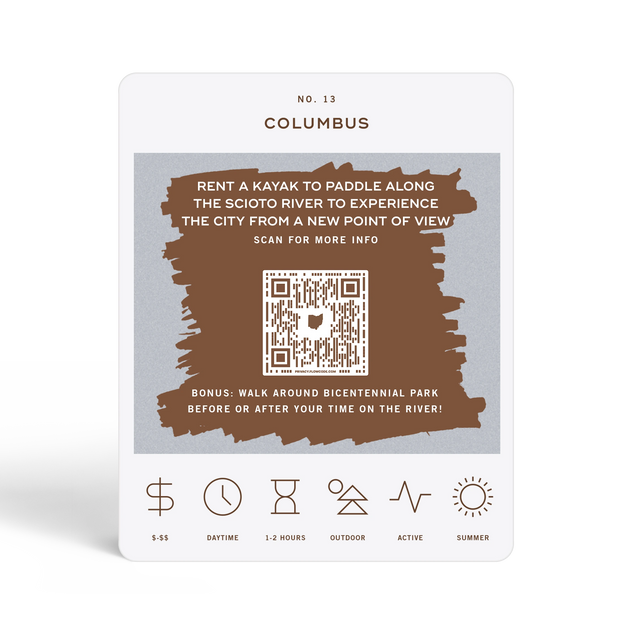 The Columbus Adventure Bucket List is a deck of 50 cards, each featuring a unique adventure within the state. Each card is labeled with the name of a city or county to indicate where the adventure takes place. At the bottom of each card, there are icons that provide additional details about the adventure, including its price range, duration, recommended time of day, and season. To discover the adventure, simply scratch off the card. If you want more information about the activity, scan the QR code on the card with your phone. This will take you to a website where you can learn more about the adventure and get tips on how to make the most of your experience.