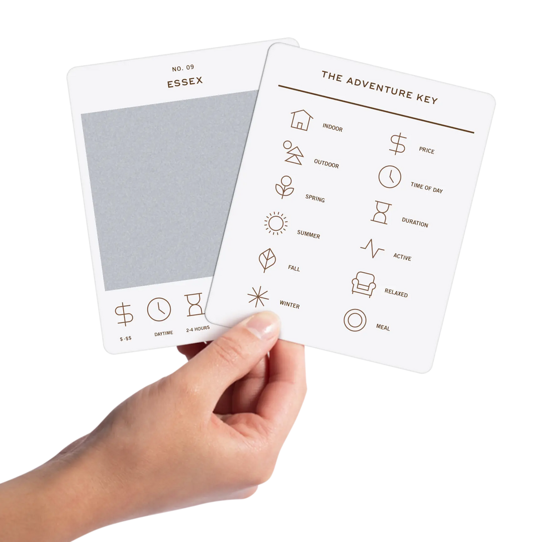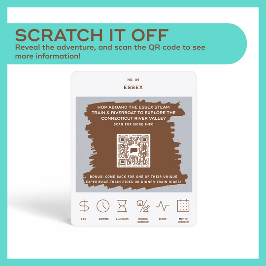 The Connecticut Adventure Bucket List is a deck of 50 cards, each featuring a unique adventure within the state. Each card is labeled with the name of a city or county to indicate where the adventure takes place. At the bottom of each card, there are icons that provide additional details about the adventure, including its price range, duration, recommended time of day, and season. To discover the adventure, simply scratch off the card. If you want more information about the activity, scan the QR code on the card with your phone. This will take you to a website where you can learn more about the adventure and get tips on how to make the most of your experience.