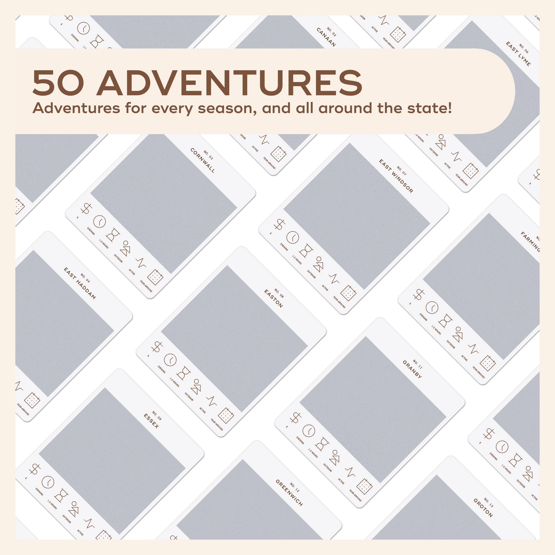 50 scratch off bucket list adventures around the state of Connecticut. Pick a city that you want to explore, check out the icons at the bottom of the card to determine the season, cost, and time of day, and then scratch off the card to reveal your adventure!