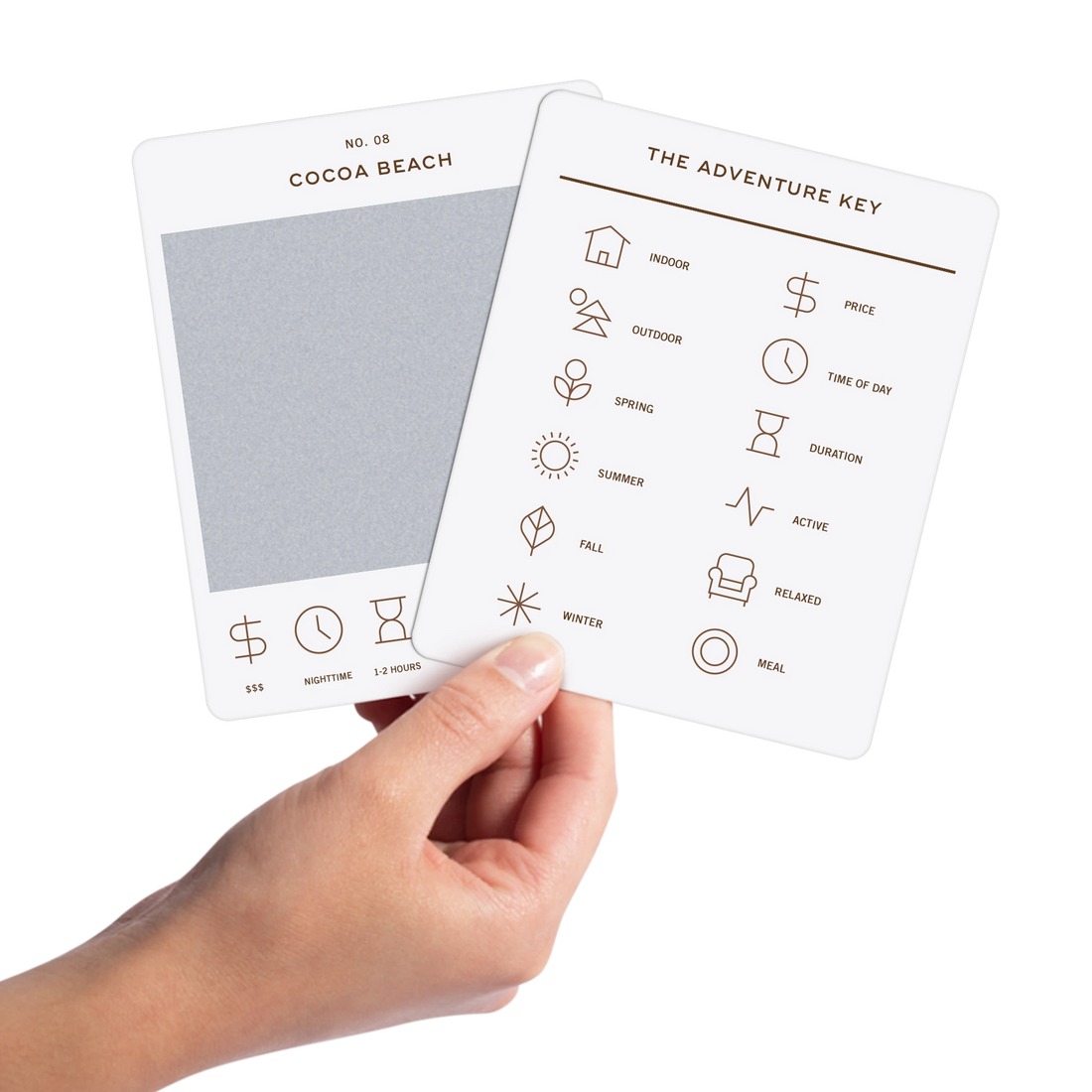 The Florida Adventure Bucket List is a deck of 50 cards, each featuring a unique adventure within the state. Each card is labeled with the name of a city or county to indicate where the adventure takes place. At the bottom of each card, there are icons that provide additional details about the adventure, including its price range, duration, recommended time of day, and season. To discover the adventure, simply scratch off the card. If you want more information about the activity, scan the QR code on the card with your phone. This will take you to a website where you can learn more about the adventure and get tips on how to make the most of your experience.
