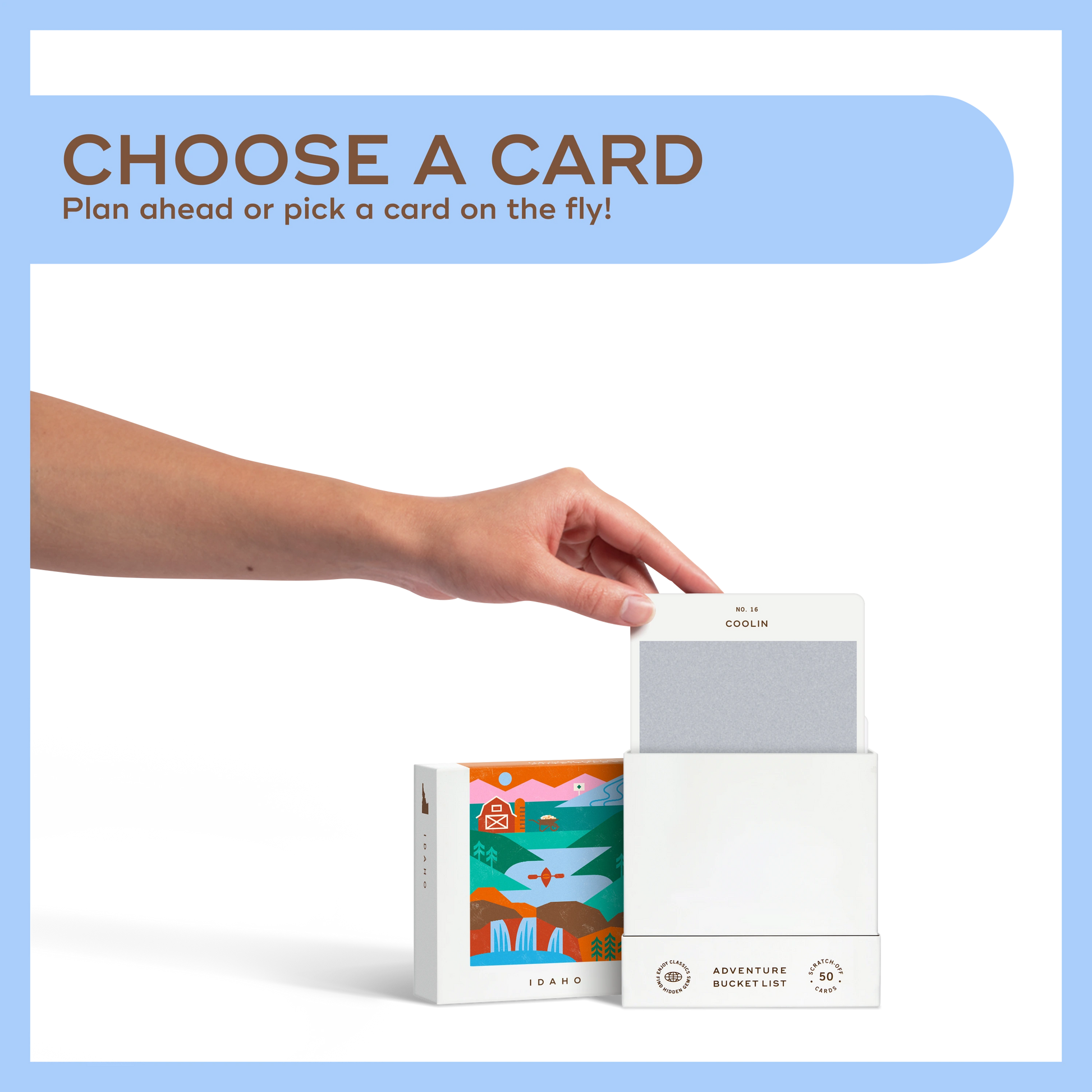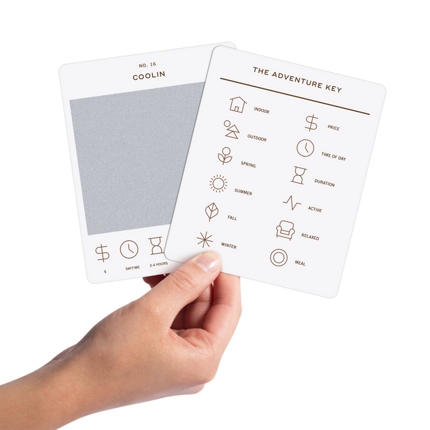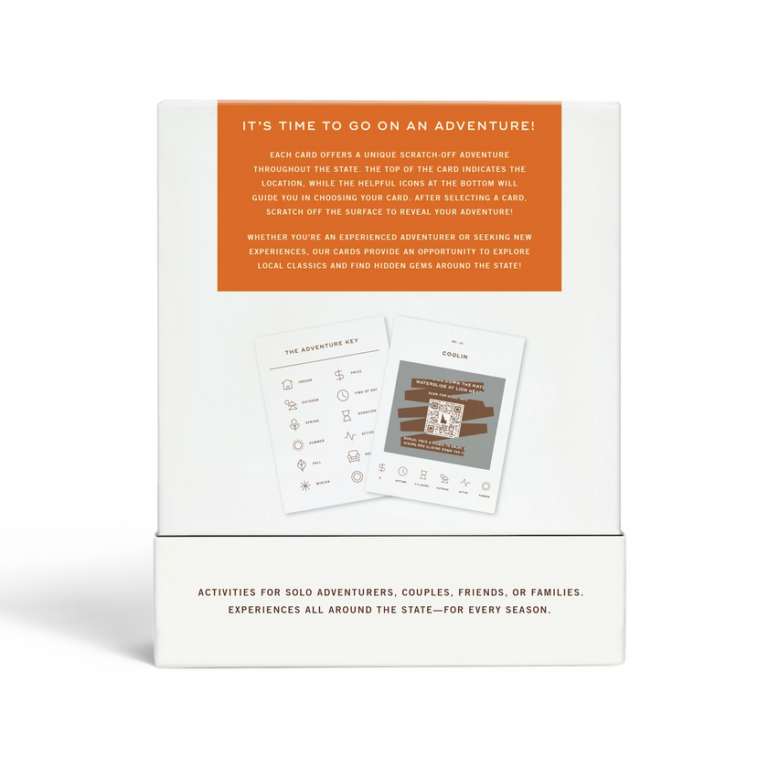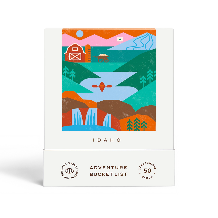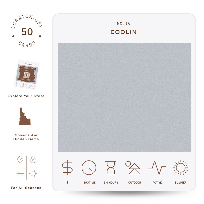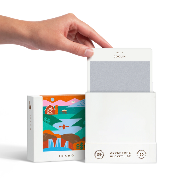 50 scratch off bucket list adventures around the state of Idaho. Pick a city that you want to explore, check out the icons at the bottom of the card to determine the season, cost, and time of day, and then scratch off the card to reveal your adventure!
