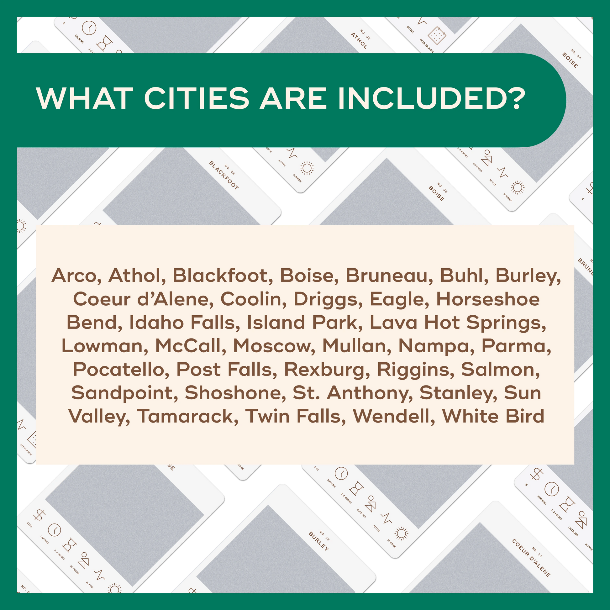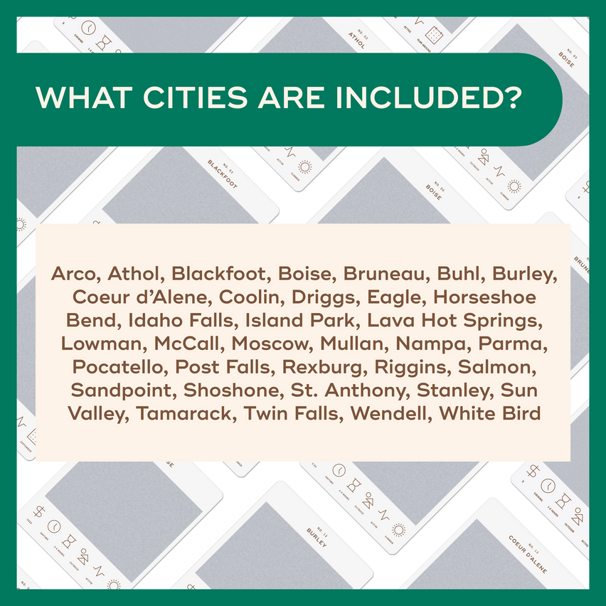 Arco, Athol, Blackfoot, Boise, Bruneau, Buhl, Burley, Coeur d'Alene, Coolin, Driggs, Eagle, Horseshoe Bend, Idaho Falls, Island Park, Lava Hot Springs, Lowman, McCall, Moscow, Mullan, Nampa, Parma, Pocatello, Post Falls, Rexburg, Riggins, Salmon, Sandpoint, Shoshone, St. Anthony, Stanley, Sun Valley, Tamarack, Twin Falls, Wendell, and White Bird. We don't have a card for every city, but we did try to get a wide variety!