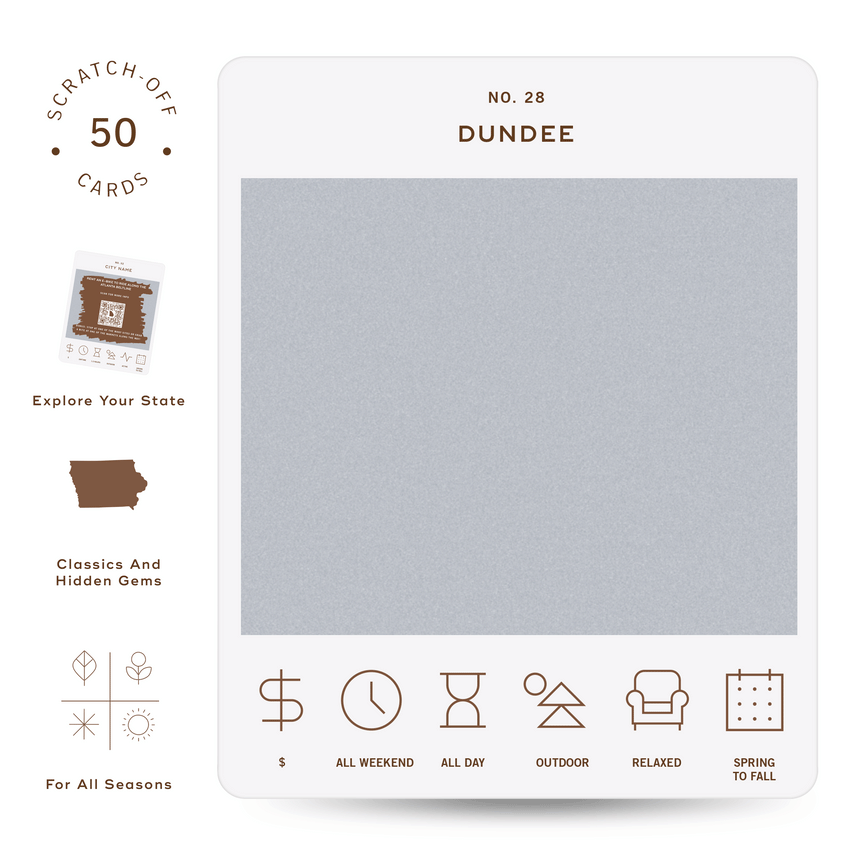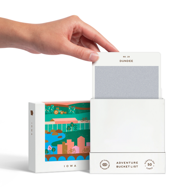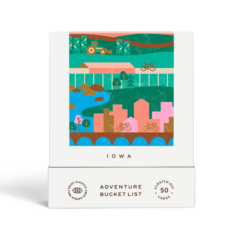 50 scratch off bucket list adventures around the state of Iowa. Pick a city that you want to explore, check out the icons at the bottom of the card to determine the season, cost, and time of day, and then scratch off the card to reveal your adventure!