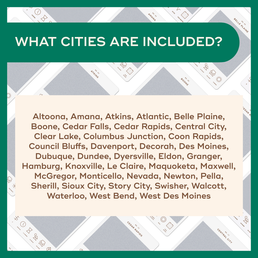 Altoona, Amana, Atkins, Atlantic, Belle Plaine, Boone, Cedar Falls, Cedar Rapids, Central City, Clear Lake, Columbus Junction, Coon Rapids, Council Bluffs, Davenport, Decorah, Des Moines, Dubuque, Dundee, Dyersville, Eldon, Granger, Hamburg, Knoxville, Le Claire, Maquoketa, Maxwell, McGregor, Monticello, Nevada, Newton, Pella, Sherill, Sioux City, Story City, Swisher, Walcott, Waterloo, West Bend, and West Des Moines. We don't have a card for every city, but we did try to get a wide variety!