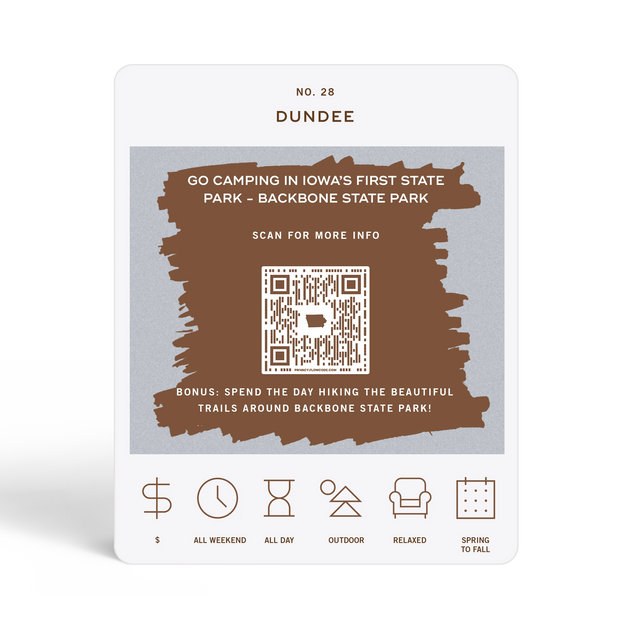 The Iowa Adventure Bucket List is a deck of 50 cards, each featuring a unique adventure within the state. Each card is labeled with the name of a city or county to indicate where the adventure takes place. At the bottom of each card, there are icons that provide additional details about the adventure, including its price range, duration, recommended time of day, and season. To discover the adventure, simply scratch off the card. If you want more information about the activity, scan the QR code on the card with your phone. This will take you to a website where you can learn more about the adventure and get tips on how to make the most of your experience.