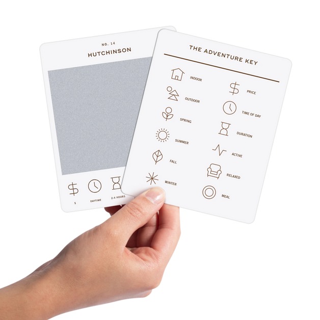 50 scratch off bucket list adventures around the state of Kansas. Pick a city that you want to explore, check out the icons at the bottom of the card to determine the season, cost, and time of day, and then scratch off the card to reveal your adventure!