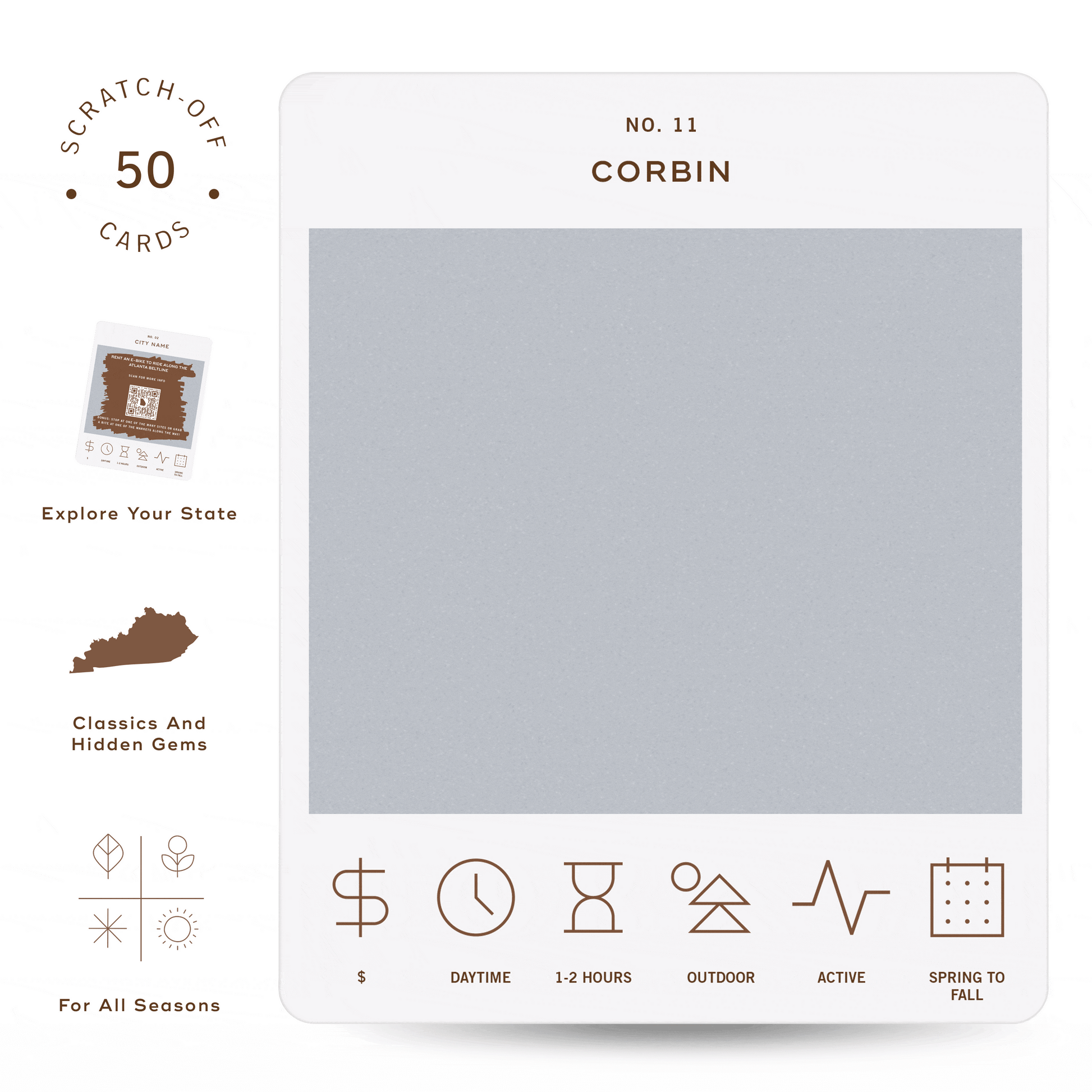 50 scratch off bucket list adventures around the state of Kentucky. Pick a city that you want to explore, check out the icons at the bottom of the card to determine the season, cost, and time of day, and then scratch off the card to reveal your adventure!