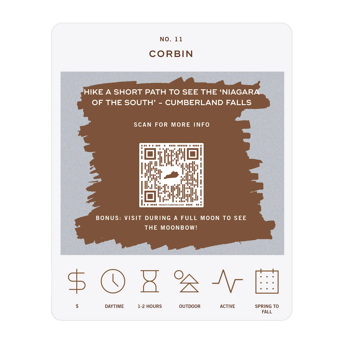 The Kentucky Adventure Bucket List is a deck of 50 cards, each featuring a unique adventure within the state. Each card is labeled with the name of a city or county to indicate where the adventure takes place. At the bottom of each card, there are icons that provide additional details about the adventure, including its price range, duration, recommended time of day, and season. To discover the adventure, simply scratch off the card. If you want more information about the activity, scan the QR code on the card with your phone. This will take you to a website where you can learn more about the adventure and get tips on how to make the most of your experience.
