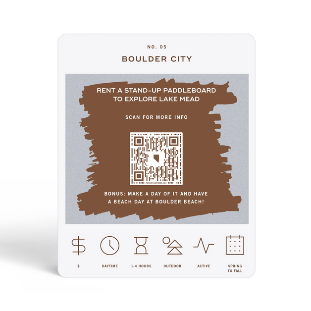 The Las Vegas Adventure Bucket List is a deck of 50 cards, each featuring a unique adventure within the state. Each card is labeled with the name of a city or county to indicate where the adventure takes place. At the bottom of each card, there are icons that provide additional details about the adventure, including its price range, duration, recommended time of day, and season. To discover the adventure, simply scratch off the card. If you want more information about the activity, scan the QR code on the card with your phone. This will take you to a website where you can learn more about the adventure and get tips on how to make the most of your experience.