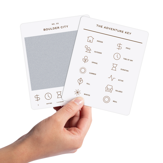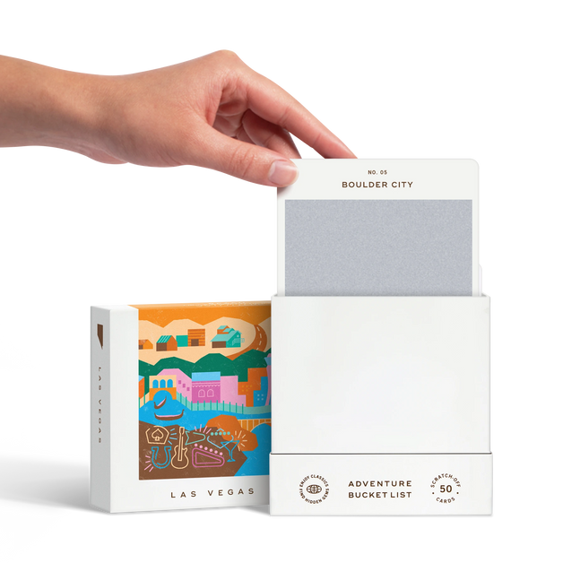 50 scratch off bucket list adventures all within one hour of the city of Las Vegas. Pick an area of the city that you want to explore, check out the icons at the bottom of the card to determine the season, cost, and time of day, and then scratch off the card to reveal your adventure!