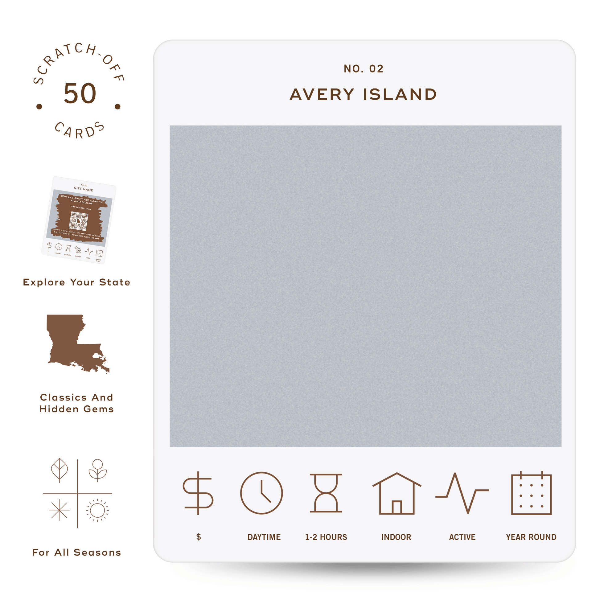 50 scratch off bucket list adventures around the state of Louisiana. Pick a city that you want to explore, check out the icons at the bottom of the card to determine the season, cost, and time of day, and then scratch off the card to reveal your adventure!