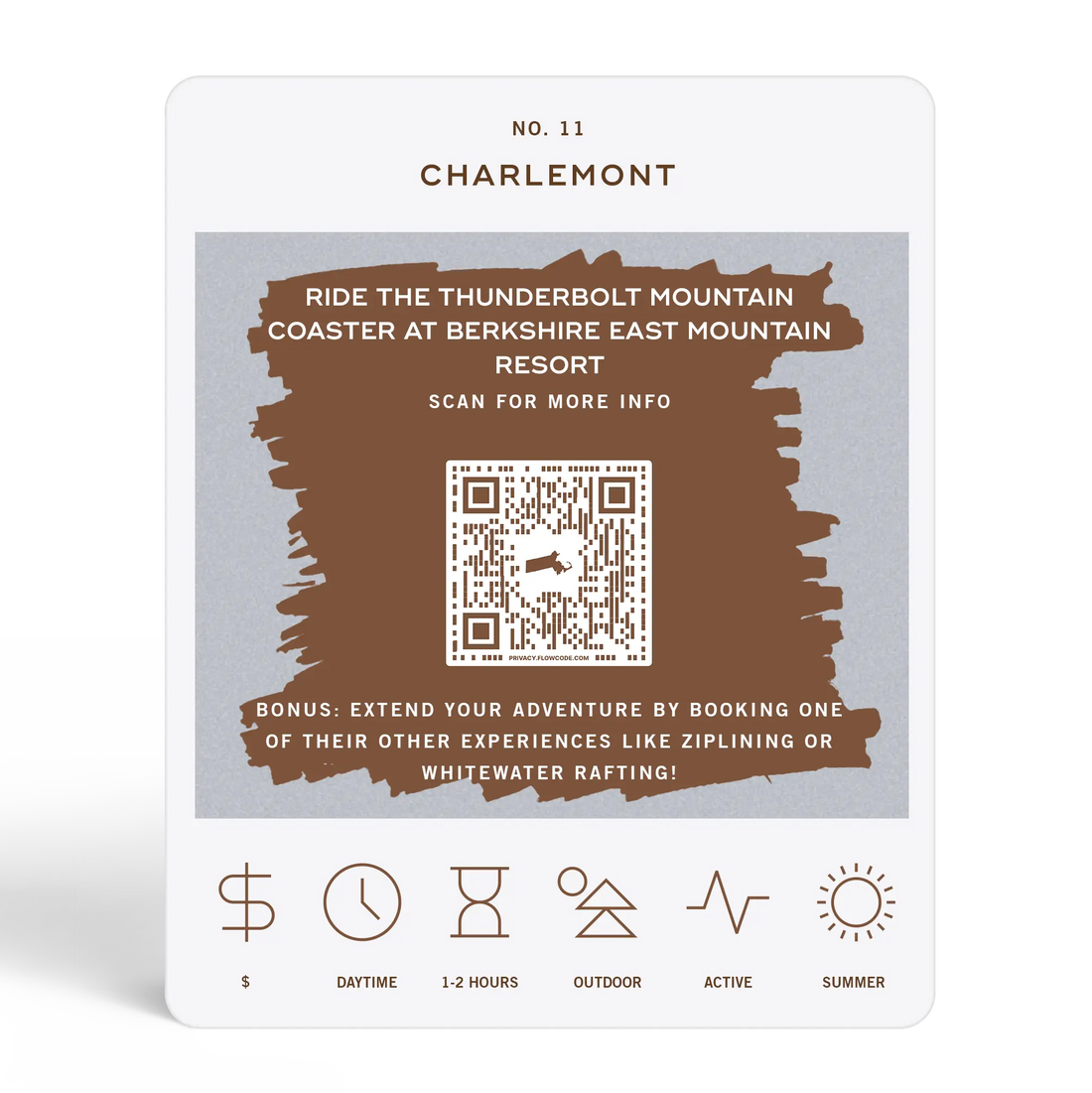 The Massachusetts Adventure Bucket List is a deck of 50 cards, each featuring a unique adventure within the state. Each card is labeled with the name of a city or county to indicate where the adventure takes place. At the bottom of each card, there are icons that provide additional details about the adventure, including its price range, duration, recommended time of day, and season. To discover the adventure, simply scratch off the card. If you want more information about the activity, scan the QR code on the card with your phone. This will take you to a website where you can learn more about the adventure and get tips on how to make the most of your experience.
