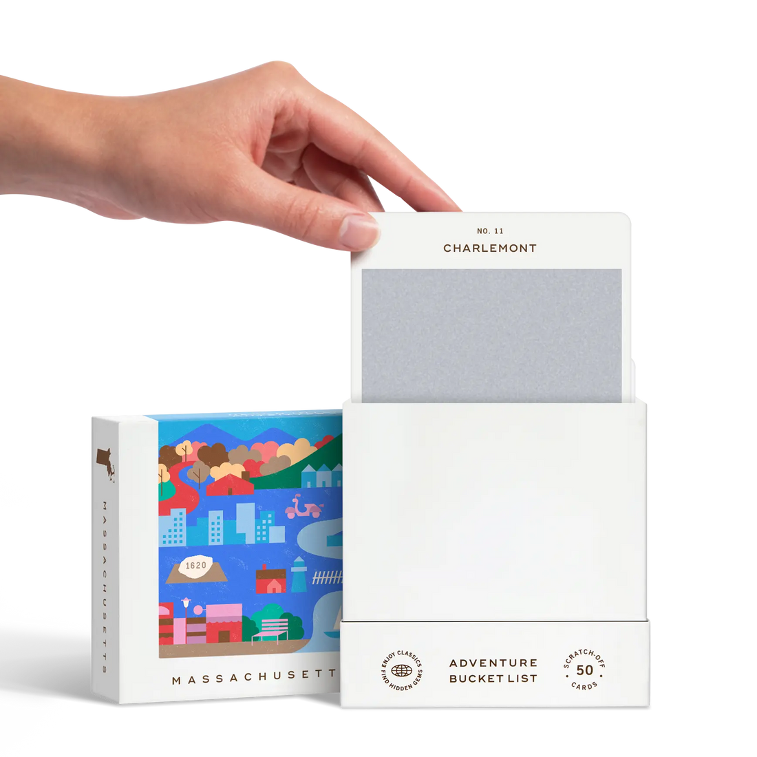 50 scratch off bucket list adventures around the state of Massachusetts. Pick a city that you want to explore, check out the icons at the bottom of the card to determine the season, cost, and time of day, and then scratch off the card to reveal your adventure!