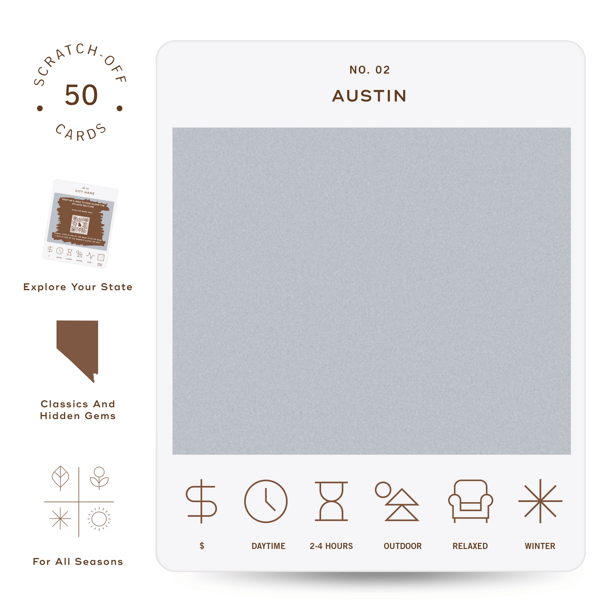 50 scratch off bucket list adventures around the state of Nevada. Pick a city that you want to explore, check out the icons at the bottom of the card to determine the season, cost, and time of day, and then scratch off the card to reveal your adventure!