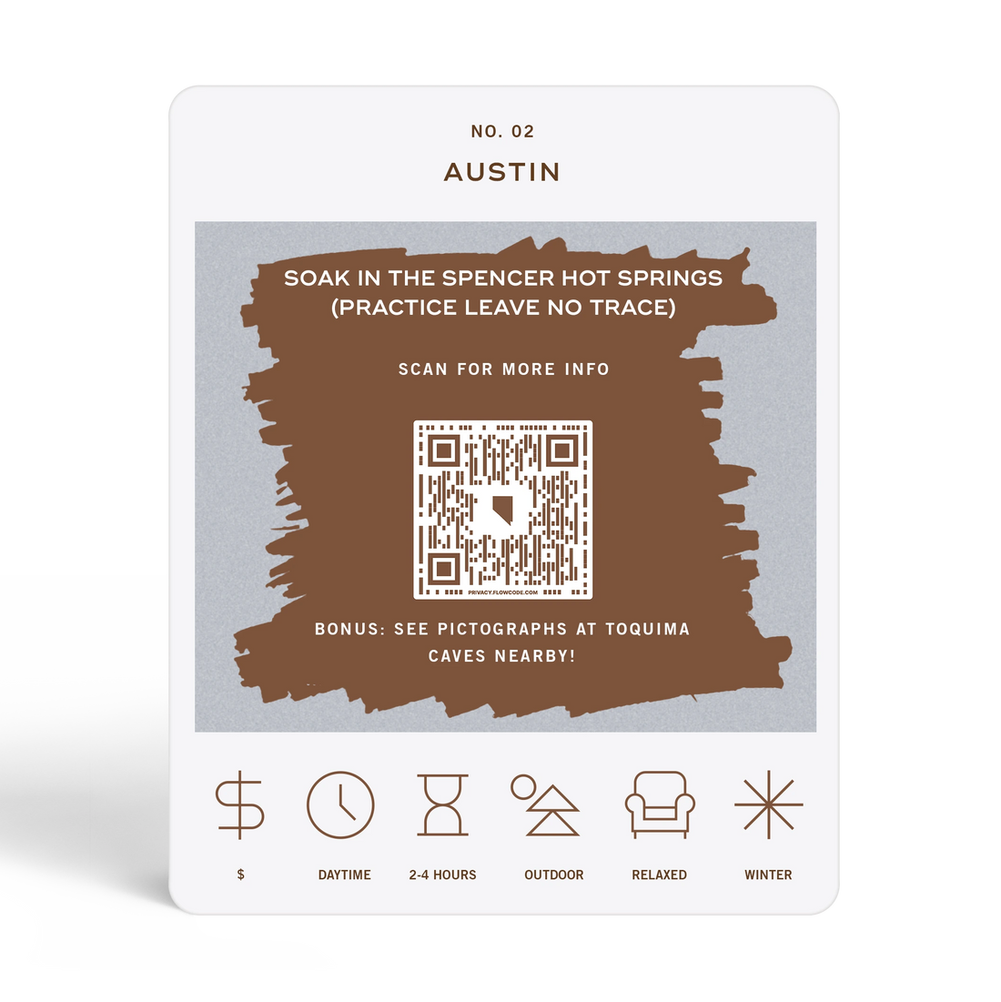 Each adventure card in the Nevada Adventure Bucket List has a hidden QR code that can be scanned using a smartphone camera. The QR code will lead you to a page on our website that offers additional information and links for the adventure, including maps and any other resources that might be helpful for planning and completing the activity. While the QR code is not required to complete the adventure, it can be a useful supplement for those who want more information or guidance.
