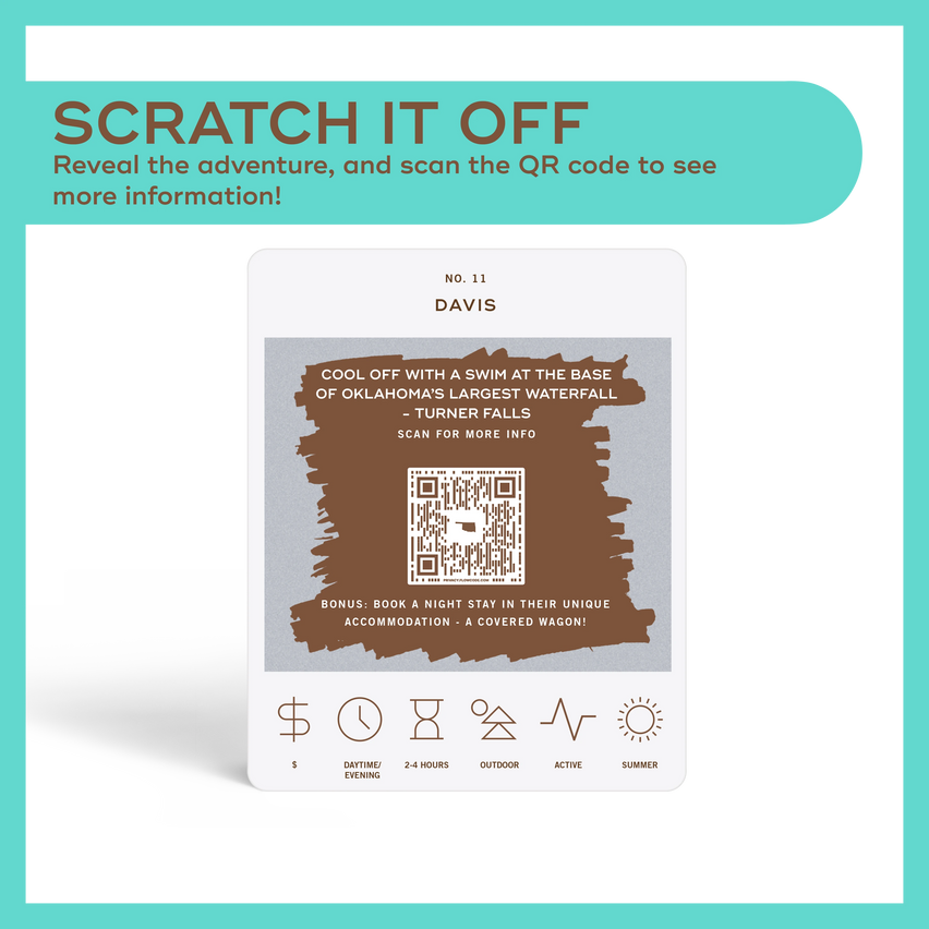 The Oklahoma Adventure Bucket List is a deck of 50 cards, each featuring a unique adventure within the state. Each card is labeled with the name of a city or county to indicate where the adventure takes place. At the bottom of each card, there are icons that provide additional details about the adventure, including its price range, duration, recommended time of day, and season. To discover the adventure, simply scratch off the card. If you want more information about the activity, scan the QR code on the card with your phone. This will take you to a website where you can learn more about the adventure and get tips on how to make the most of your experience.