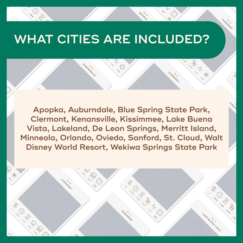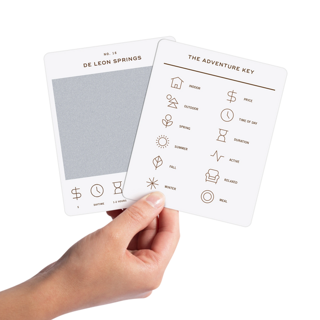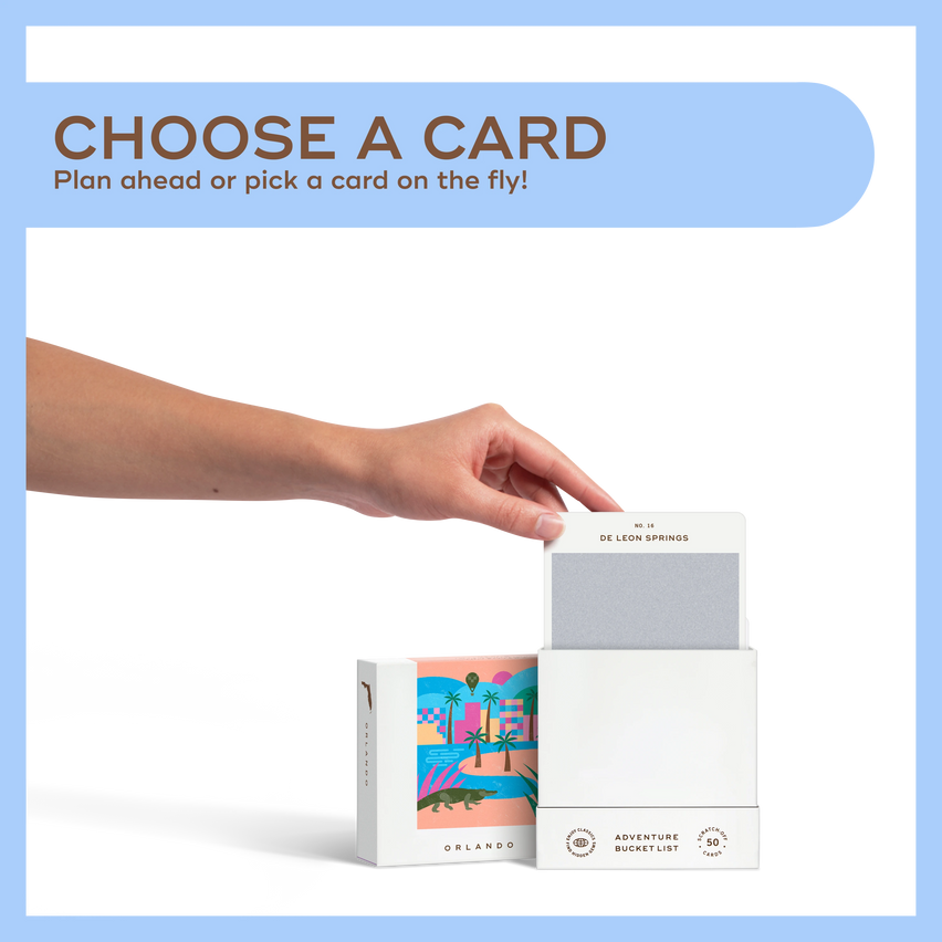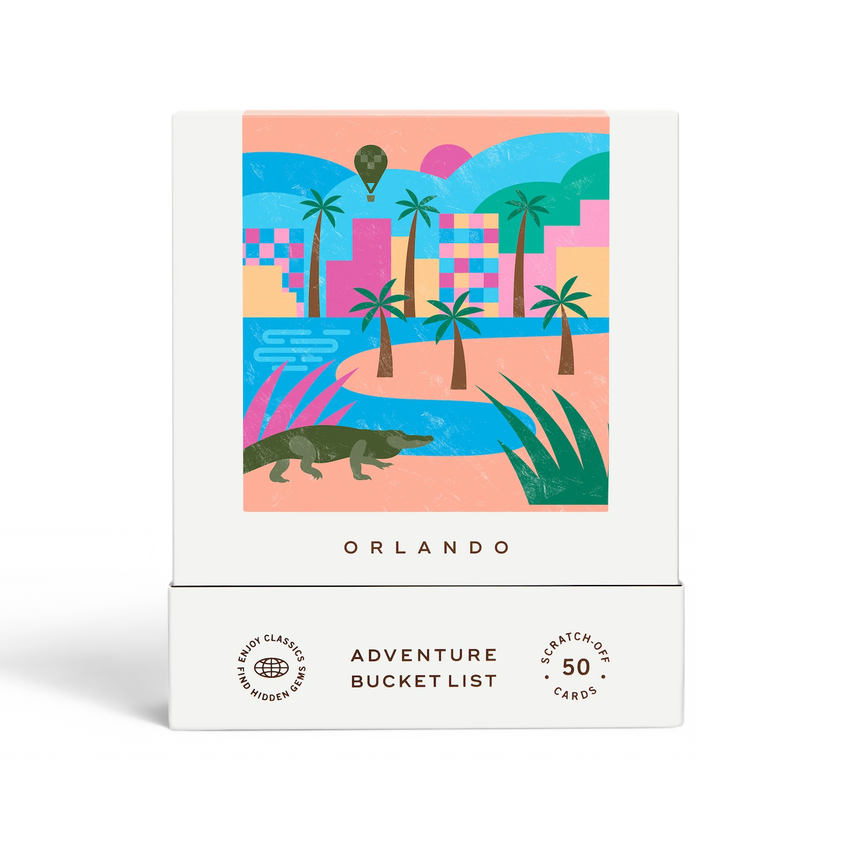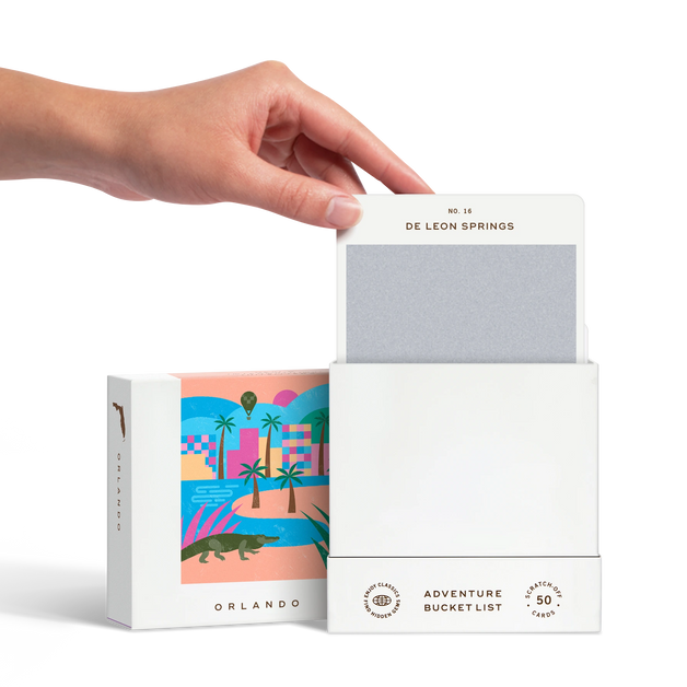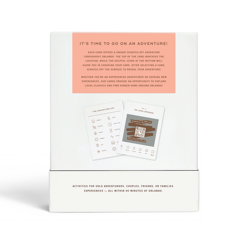 50 scratch off bucket list adventures all within one hour of the city of Orlando. Pick an area of the city that you want to explore, check out the icons at the bottom of the card to determine the season, cost, and time of day, and then scratch off the card to reveal your adventure!