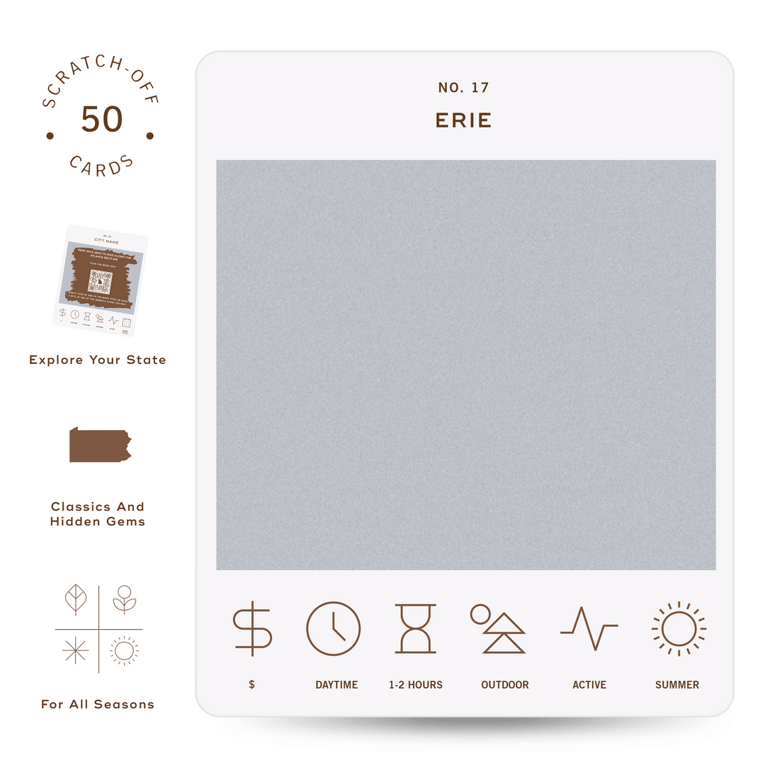 The Pennsylvania Adventure Bucket List is a deck of 50 cards, each featuring a unique adventure within the state. Each card is labeled with the name of a city or county to indicate where the adventure takes place. At the bottom of each card, there are icons that provide additional details about the adventure, including its price range, duration, recommended time of day, and season. To discover the adventure, simply scratch off the card. If you want more information about the activity, scan the QR code on the card with your phone. This will take you to a website where you can learn more about the adventure and get tips on how to make the most of your experience.