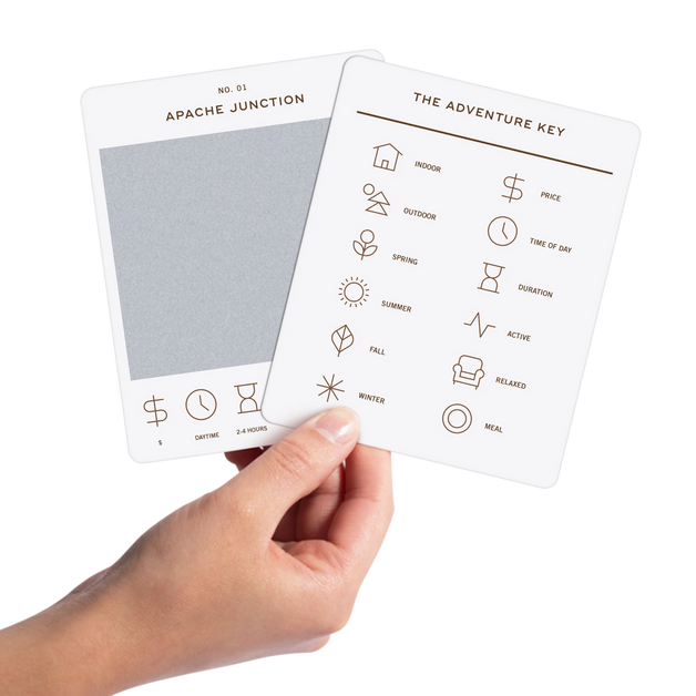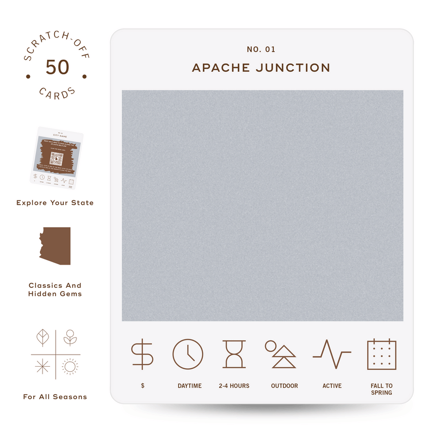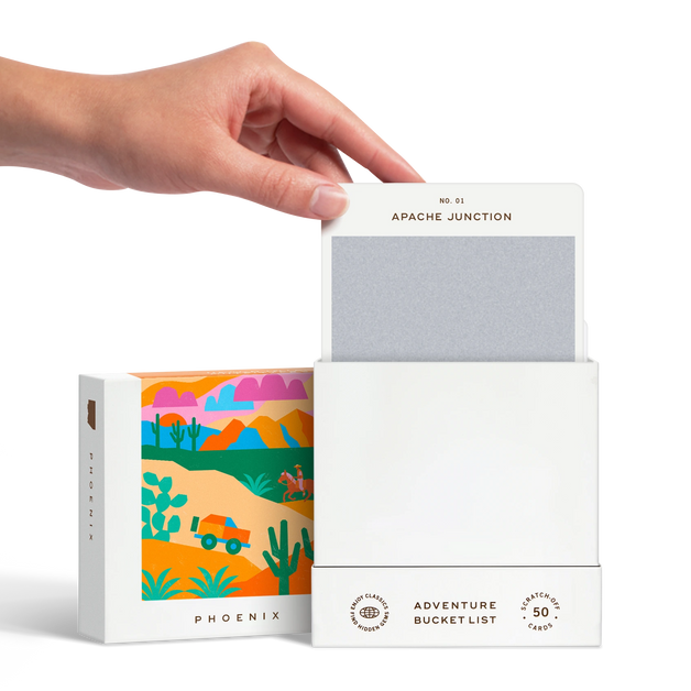 50 scratch off bucket list adventures all within one hour of the city of Phoenix. Pick an area of the city that you want to explore, check out the icons at the bottom of the card to determine the season, cost, and time of day, and then scratch off the card to reveal your adventure!