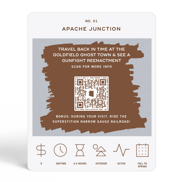 The Phoenix Adventure Bucket List is a deck of 50 cards, each featuring a unique adventure within the state. Each card is labeled with the name of a city or county to indicate where the adventure takes place. At the bottom of each card, there are icons that provide additional details about the adventure, including its price range, duration, recommended time of day, and season. To discover the adventure, simply scratch off the card. If you want more information about the activity, scan the QR code on the card with your phone. This will take you to a website where you can learn more about the adventure and get tips on how to make the most of your experience.