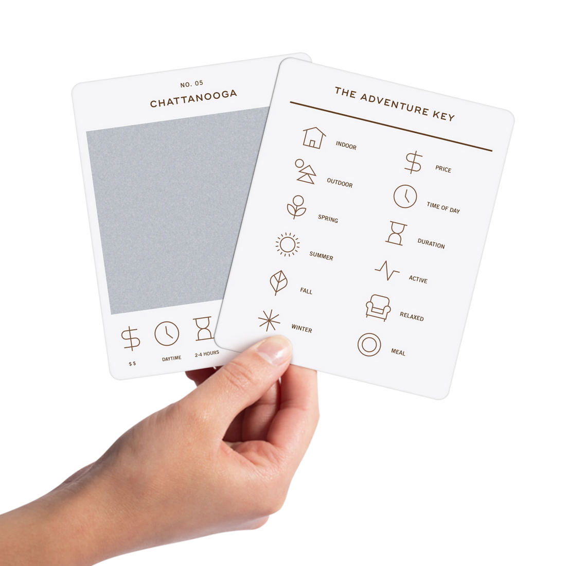 50 scratch off bucket list adventures around the state of Tennessee. Pick a city that you want to explore, check out the icons at the bottom of the card to determine the season, cost, and time of day, and then scratch off the card to reveal your adventure!