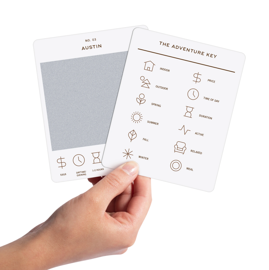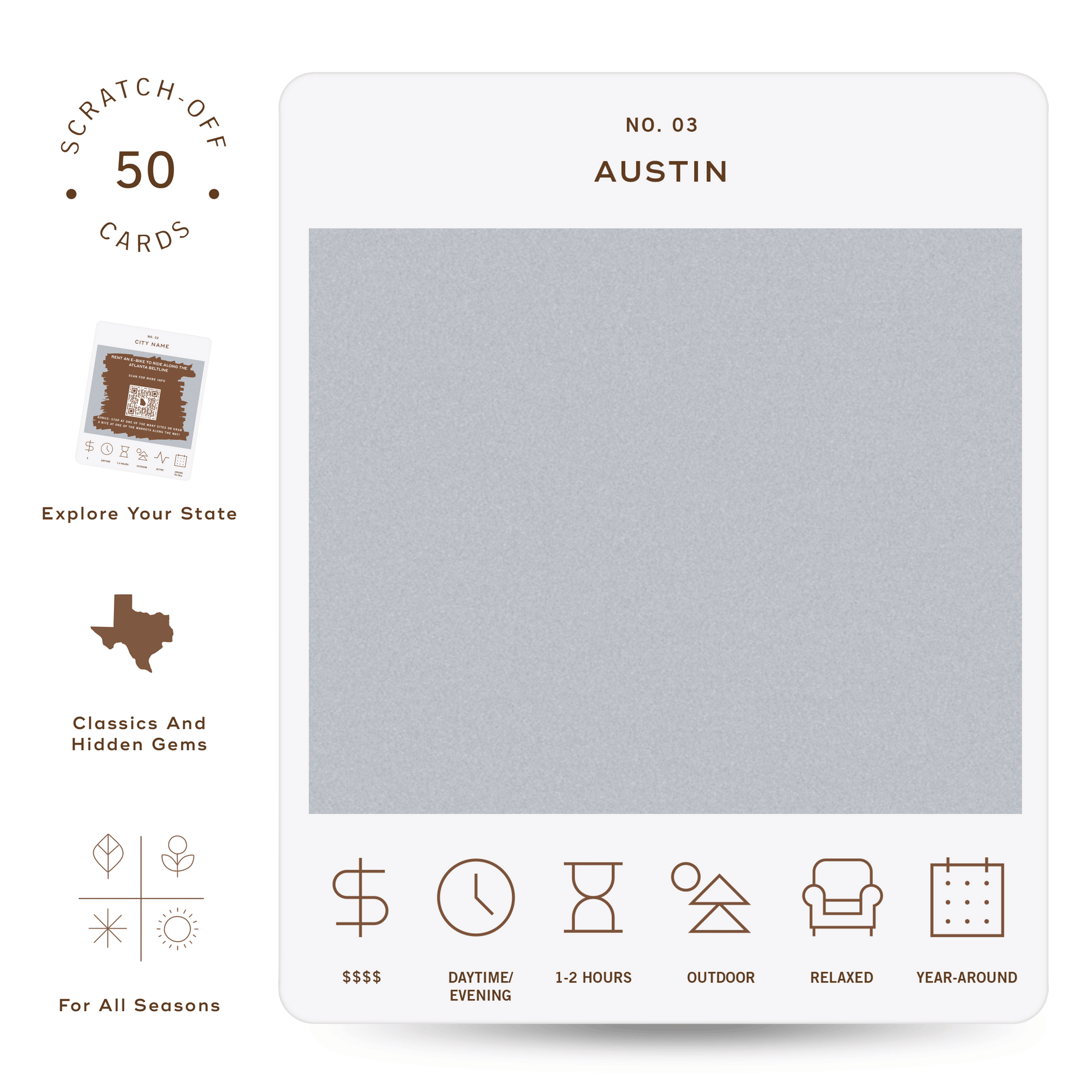 50 scratch off bucket list adventures around the state of Texas. Pick a city that you want to explore, check out the icons at the bottom of the card to determine the season, cost, and time of day, and then scratch off the card to reveal your adventure!