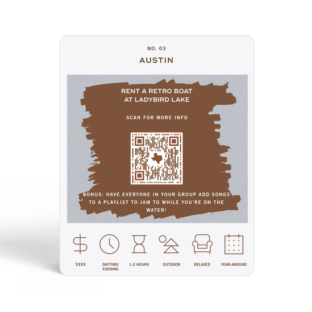 The Texas Adventure Bucket List is a deck of 50 cards, each featuring a unique adventure within the state. Each card is labeled with the name of a city or county to indicate where the adventure takes place. At the bottom of each card, there are icons that provide additional details about the adventure, including its price range, duration, recommended time of day, and season. To discover the adventure, simply scratch off the card. If you want more information about the activity, scan the QR code on the card with your phone. This will take you to a website where you can learn more about the adventure and get tips on how to make the most of your experience.