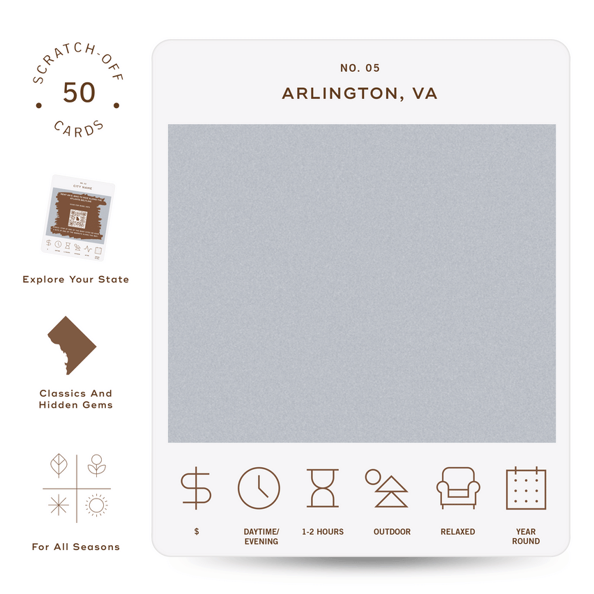 The Washington D.C. Adventure Bucket List is a deck of 50 cards, each featuring a unique adventure within the state. Each card is labeled with the name of a city or county to indicate where the adventure takes place. At the bottom of each card, there are icons that provide additional details about the adventure, including its price range, duration, recommended time of day, and season. To discover the adventure, simply scratch off the card. If you want more information about the activity, scan the QR code on the card with your phone. This will take you to a website where you can learn more about the adventure and get tips on how to make the most of your experience.