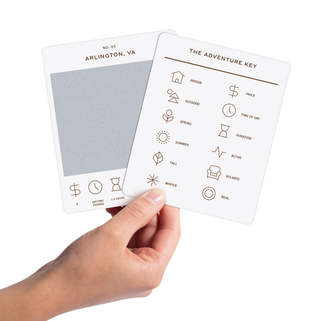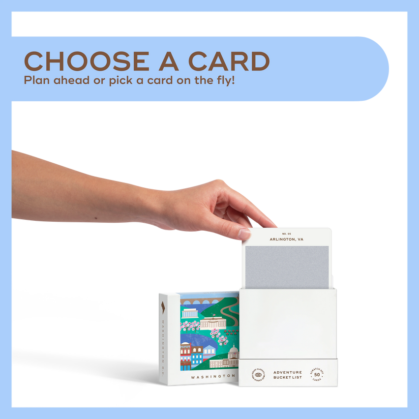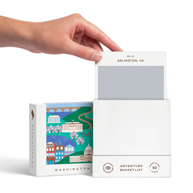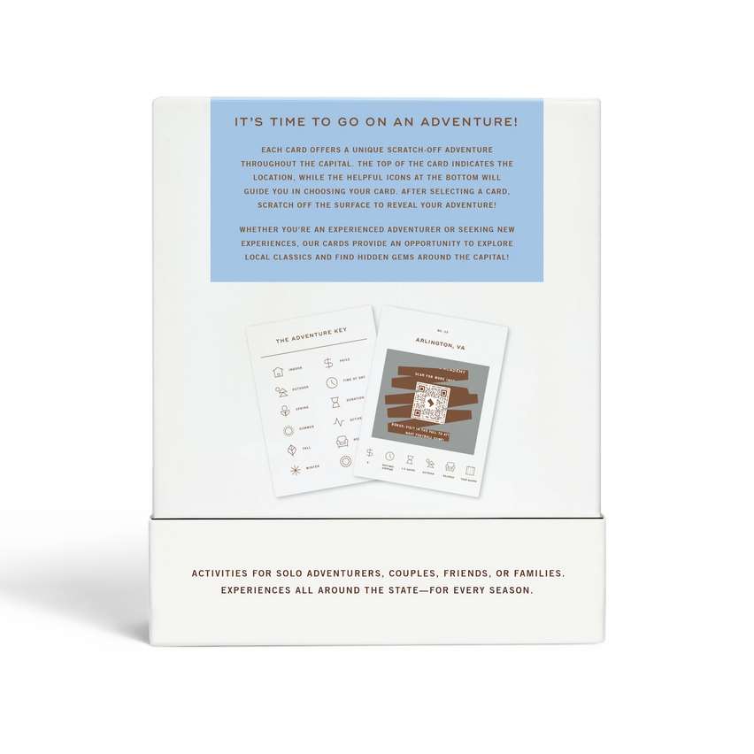 50 scratch-off bucket list adventures in & around Washington D.C. Pick an area that you want to explore, check out the icons at the bottom of the card to determine the season, cost, and time of day, and then scratch off the card to reveal your adventure!