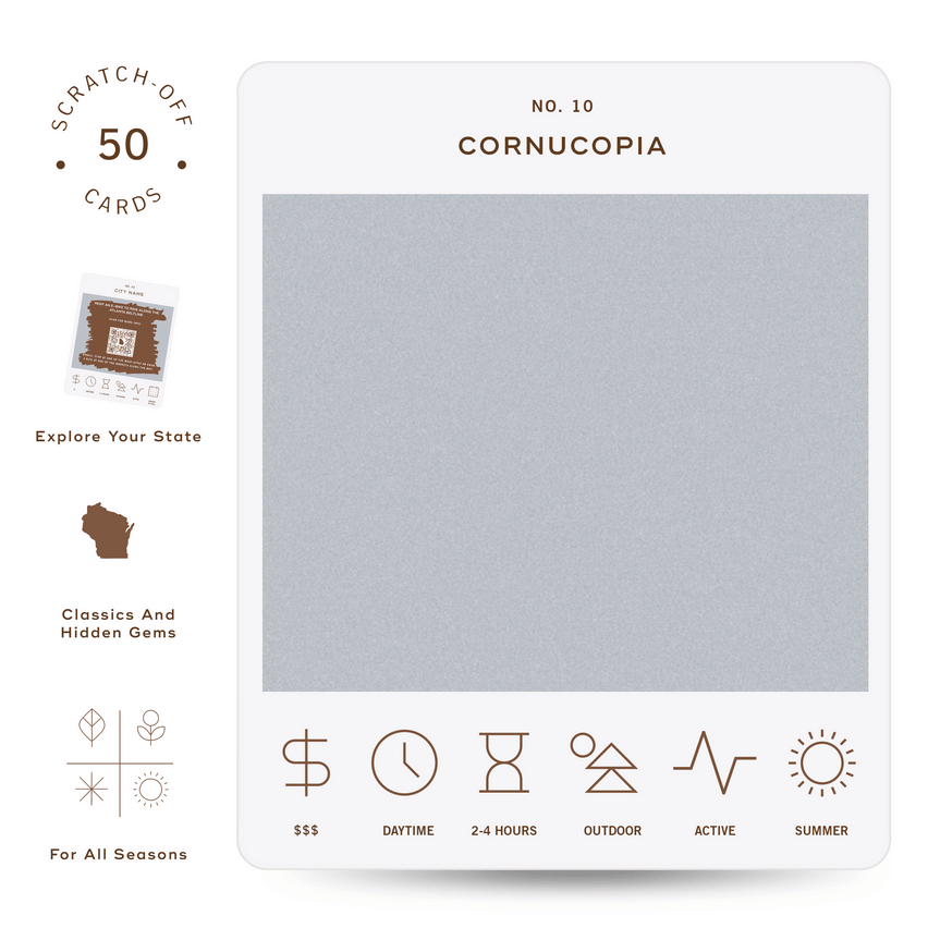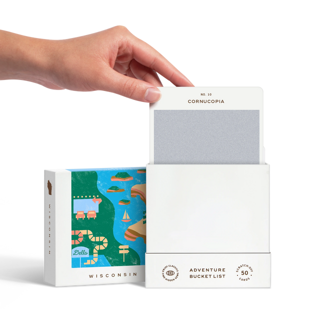 50 scratch off bucket list adventures around the state of Wisconsin. Pick a city that you want to explore, check out the icons at the bottom of the card to determine the season, cost, and time of day, and then scratch off the card to reveal your adventure!